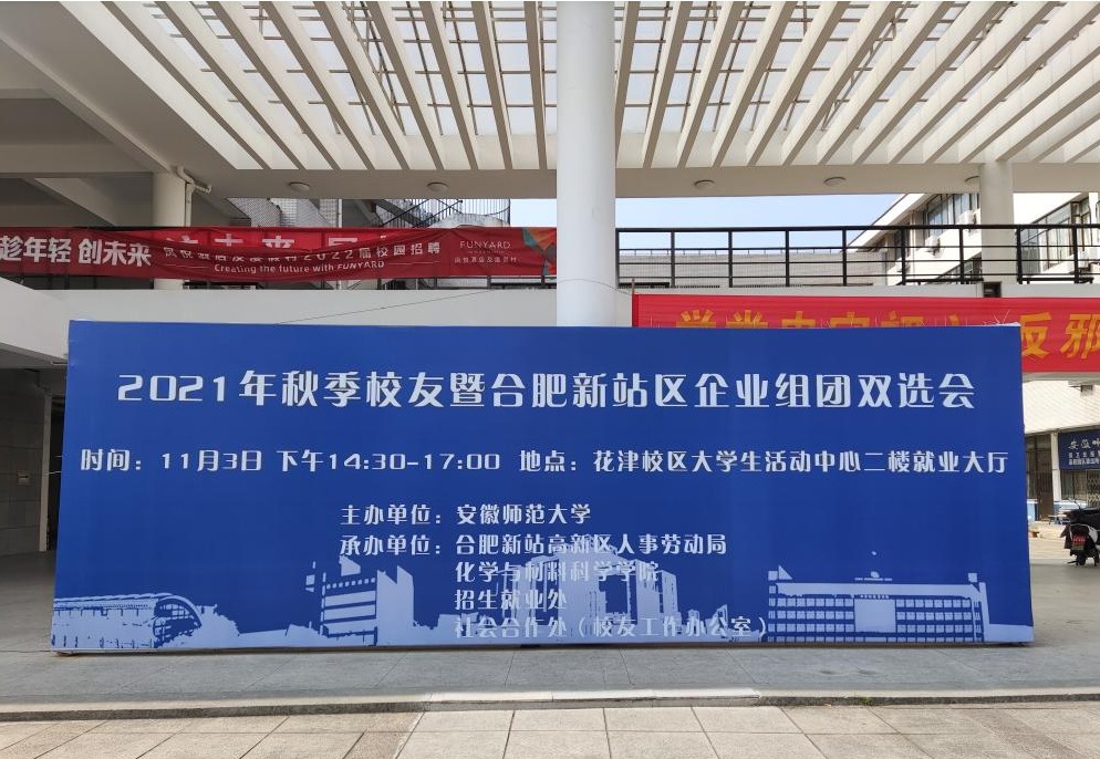 承办的2021年秋季校友暨合肥新站区企业组团双选会在花津校区大学生活动中心二楼就业招聘大厅举办。本次招聘会吸引了包括合肥京东方、国轩高科、乐凯科技、光晋科技、微睿光电、维信诺科技等50多家优质企业参会,招聘岗位涵盖化工、材料、化学、机械、电气、计算机、人力资源等诸多专业。