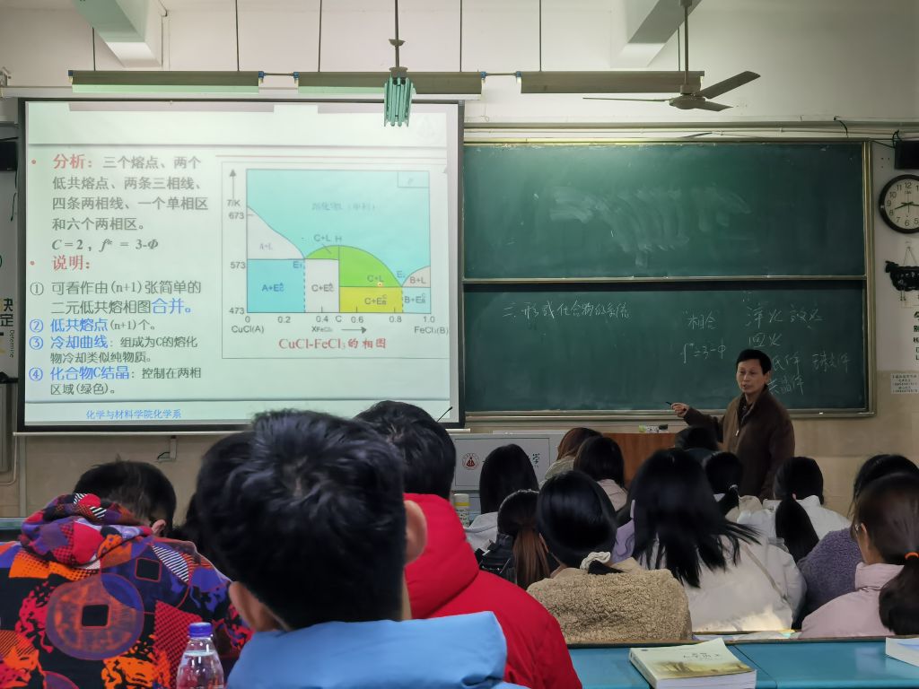 陈华茂老师在课前作了精心准备,他利用PPT播放一个弹簧的动画来引入授课内容——相平衡,通过各种不同类型的相图讲述稳定的化合物系统的形成。在授课过程中,陈老师教学思路清晰,注重与同学间的互动,提问了关于相图的线的意义,引导学生互相讨论,加深对知识点的了解和思考,并通过例题加深对知识点的掌握。通过课程讲授,陈老师展示了较高教学水平,取得了较好的教学效果,注重让学生融入课堂,充分体现了学生主体性。
