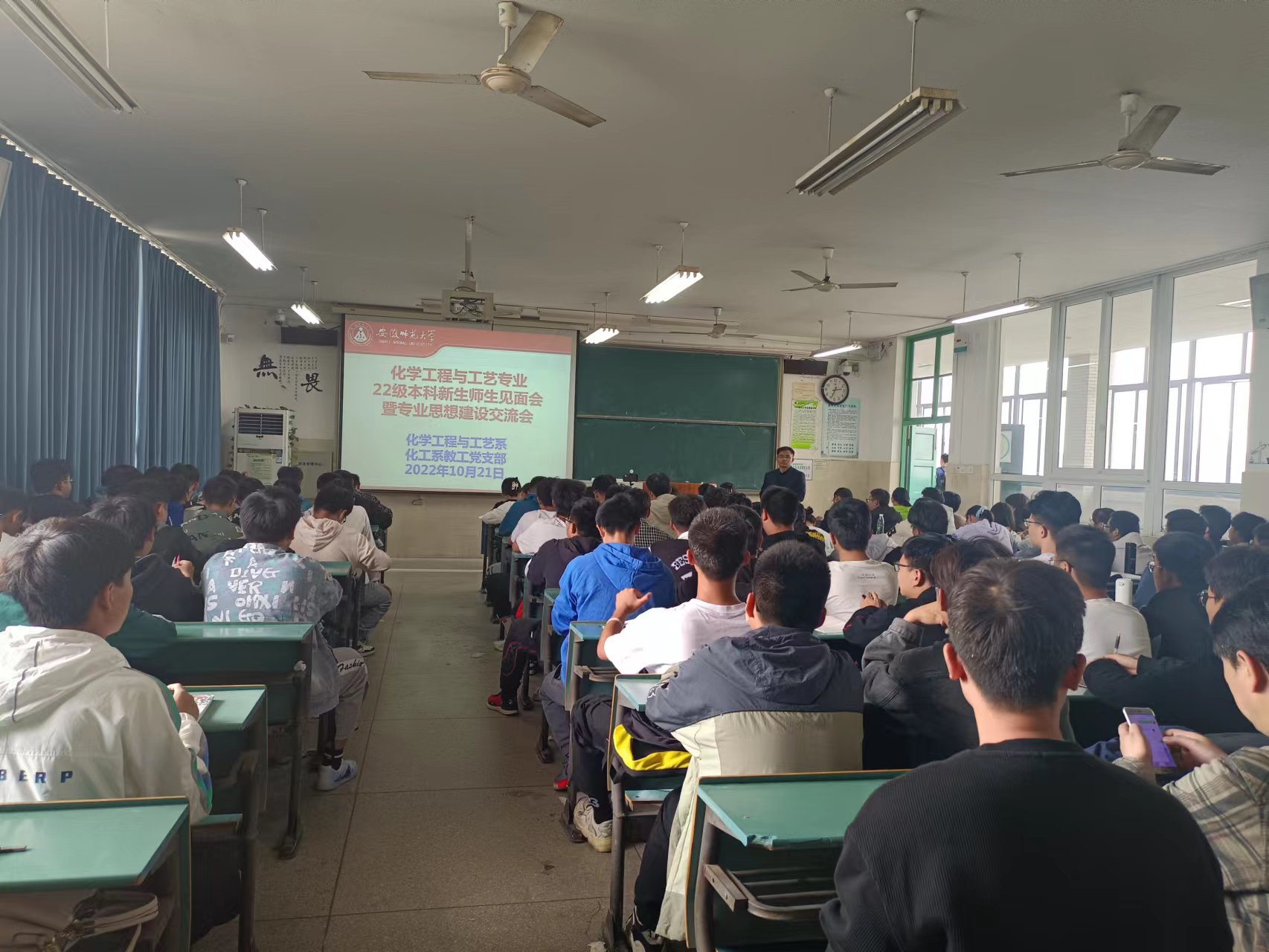 曹春旺、郁妍)为加强2022级化学工程与工艺专业新生对专业的认识和理解,提高同学们对本专业的信心,化工系于2022年10月21日下午在行知楼教室举行了2022级化工师生交流会,学院学术委员会委员罗时忠教授、化工系主任周映华、化工教工党支部书记张小璇、王伟智、李伟、宋晓晓、张修都、梁俊、王新等化工专业教师、全体化工新生参加了此次活动,会议由周映华教授主持。