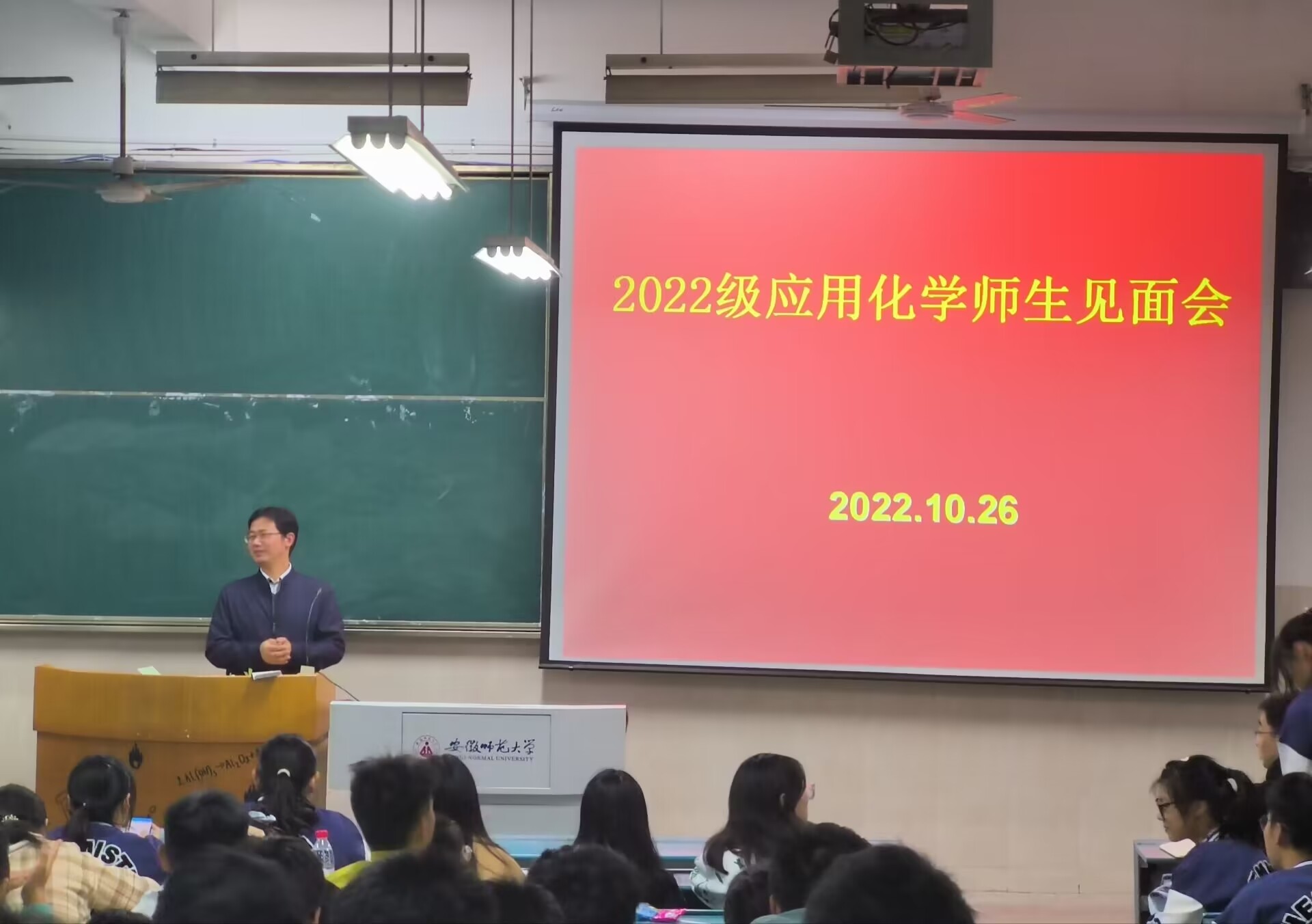 姚晋东、汪韵林)为促进2022级应用化学专业新生更快融入大学生活,提高同学们对本专业的认同感,应用化学专业于2022年10月26日下午在教学楼举行了师生交流会。周双六、倪永红、郝二宏、吴正翠、卓淑娟、田瑞芬、陈红旗、贾卫国、崔鹏、钟睿、陈郑、王见、于长江、王辉、李锋、陈曙光等应用化学专业教师和2022级应用化学专业新生参加了此次活动,会议由应用化学系主任章青老师主持。
