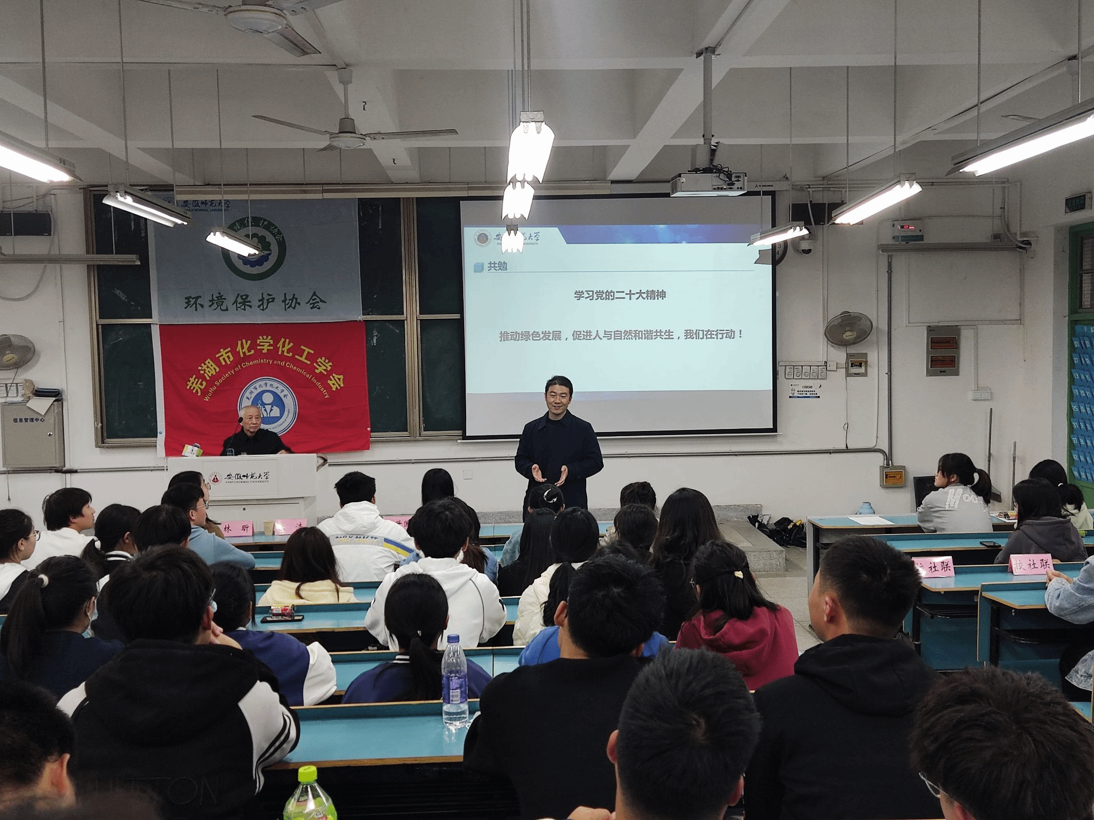 宫世国老师通过解读党的二十大精神,让大家更加深刻的了解到社会主义现代化的相关内容,并重点介绍关于推动绿色发展,促进人与自然和谐共生这一重大主题。宫老师指出绿水青山就是金山银山的理念依旧是人们对待环境的准则。宫老师向大家表达了对当代大学生殷切的期望并提出几点建议:督促学习,锻炼思考,积极实践,能够抗压,并预祝大家德才兼备,身心健康。现场的掌声久久不能平息,在场的每一位同学都受到了宫老师献词的鼓舞,环协会员吴可说:“当宫老师站在讲台的那一刻,崇拜之情油然而生,非常感谢宫老师的宣讲,听过后使我身心触动、受益匪浅。”
