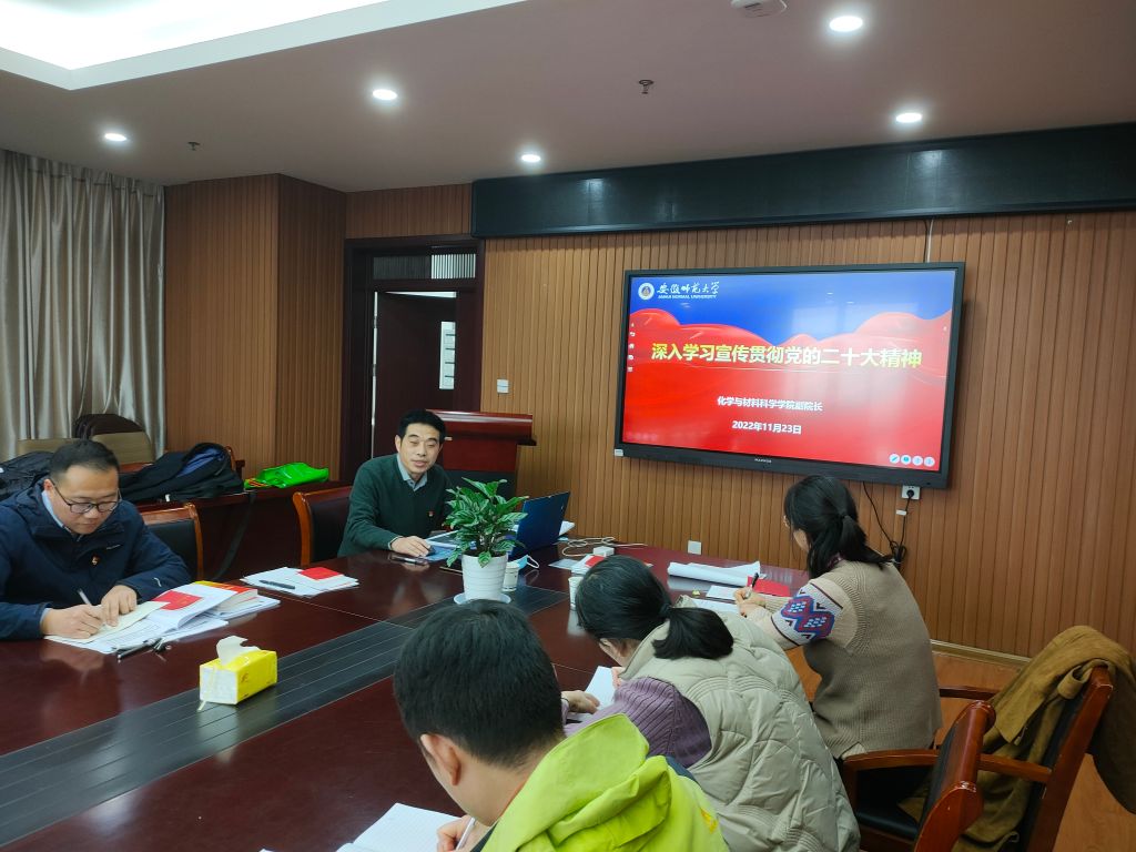 会议开始,与会人员集体观看了《中共中央关于认真学习宣传贯彻党的二十大精神的决定》《二十大代表风采录:一路烛光——路丙辉》等视频。赵全胜向各位老师传达了省委、学校和学院党委学习宣传贯彻党的二十大精神相关会议内容和具体要求。魏杰顶领学了《关于深入学习贯彻习近平总书记给北京师范大学“优师计划”师范生重要回信精神的通知》,孙红霞就《安徽师范大学学习宣传贯彻党的二十大精神实施方案》作了重点解读。接着,王波涛、唐业仓给党员同志发放《党的二十大报告》和《中国共产党章程》学习材料。根据上级党委的学习要求,实验中心党支部将创新学习形式,计划在支部中开展“党员共读二十大报告”活动, 每位党员先自学二十大报告中的一个部分(共15部分),再结合学习内容和个人工作实际,集中交流研讨、汇报学习心得。
