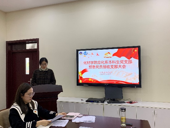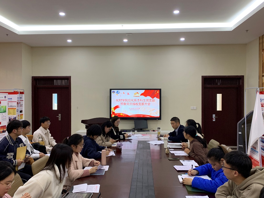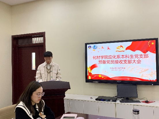 应化系本科生党支部在礼勤楼201会议室召开党支部大会,讨论接收王雨山等4名同志为中共预备党员,讨论王静等6位同志按期转正相关事宜。会议由党支部书记王芳同志主持,学院党委副书记李古州以普通党员身份参加会议。本次支部大会应到会党员18人,实到会党员18人,其中正式党员7人。