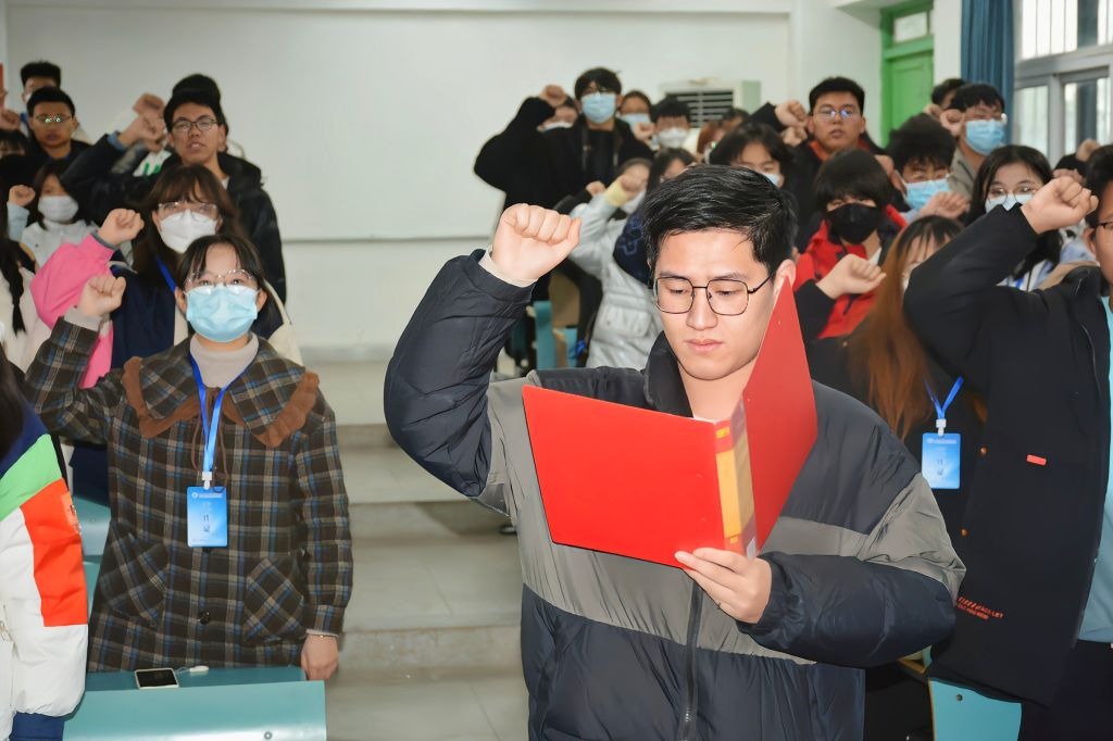 上午,伴随着庄严的国歌声,换届大会拉开了序幕。团委副书记陶勇老师为2021届团委学生会工作人员代表颁发聘书和礼品。随后,团委书记梅冠东、辅导员吴钰濛、张浩依次为新任团委、学生会主席团、部长及部员代表颁发工作证和工作手册并合影留念。主席团成员陈功洋发表了就职演讲,他说道:“我们新一届团委、学生会全体成员得到了许多宝贵经验和莫大的鼓励,也感受到更大的压力,意味着我们即将迎来更多的机遇和更大的挑战。”随后,2022届团委、学生会全体工作人员签署了《入职宣誓书》,并在团委学生会主席团成员胡博带领下庄严宣誓。