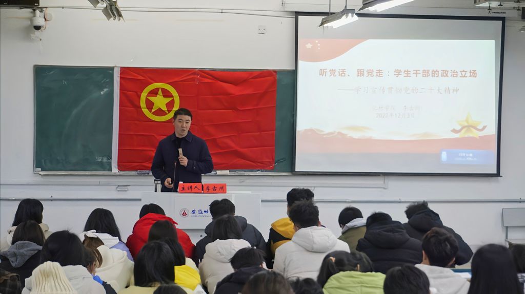 党委副书记李古州讲授“听党话,跟党走:学生干部的政治立场——学习宣传贯彻党的二十大精神”的专题讲座。他指出,青年团干肩负着中华民族伟大复兴的历史使命,学生干部肩负着桥梁与纽带、骨干与表率、服务与管理、助手与纽带的作用。新时代的学生干部应当充分发挥桥梁与纽带、带头与表率、服务与管理的作用,在工作中强化责任意识、服务意识、集体意识、创新意识等“四种意识”,提升脚力、眼力、脑力、笔力等“四种能力”,做到政治觉悟高、工作标准高、工作效率高。