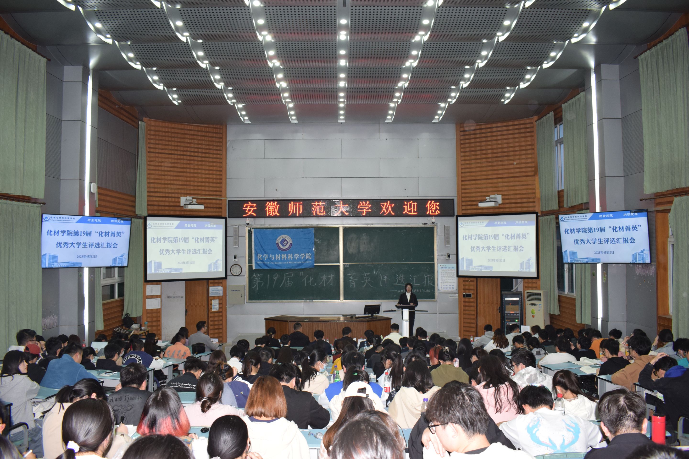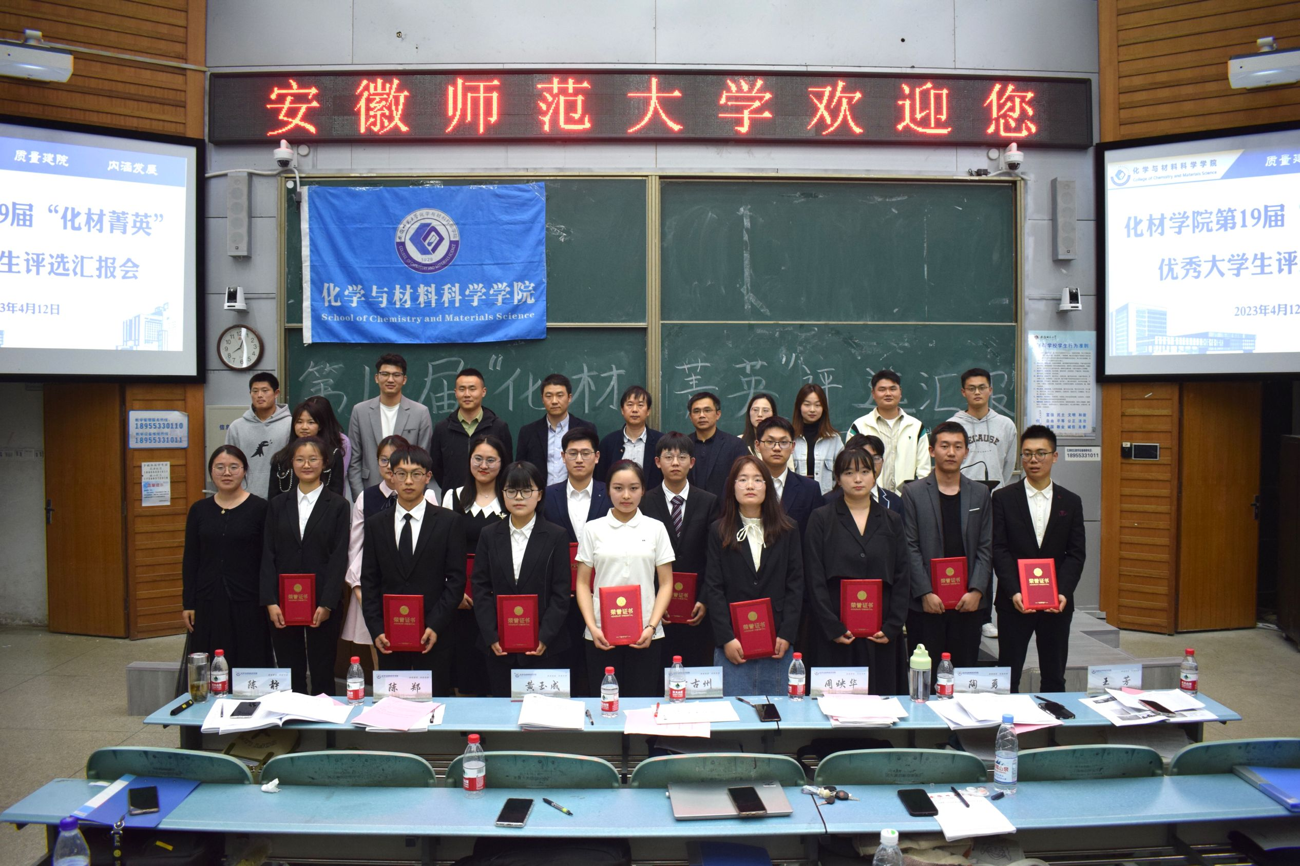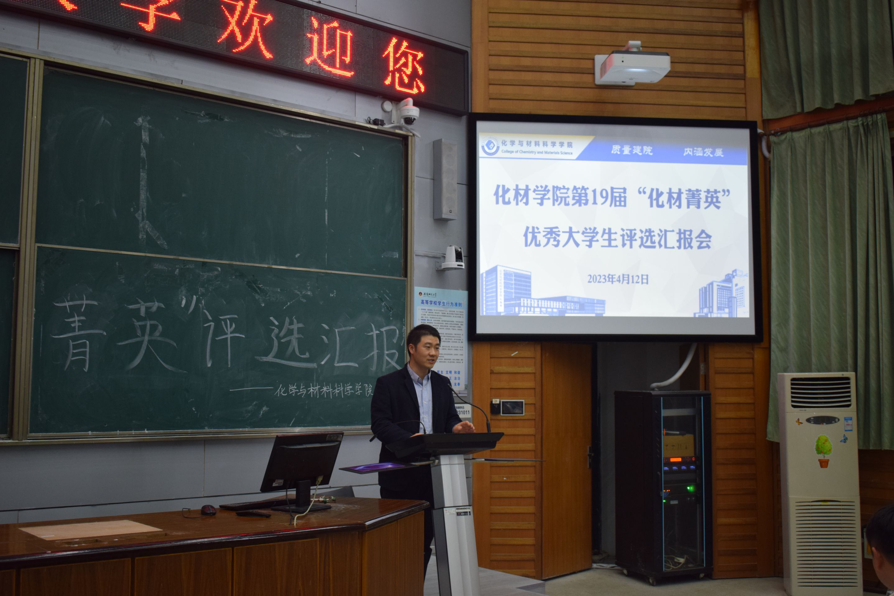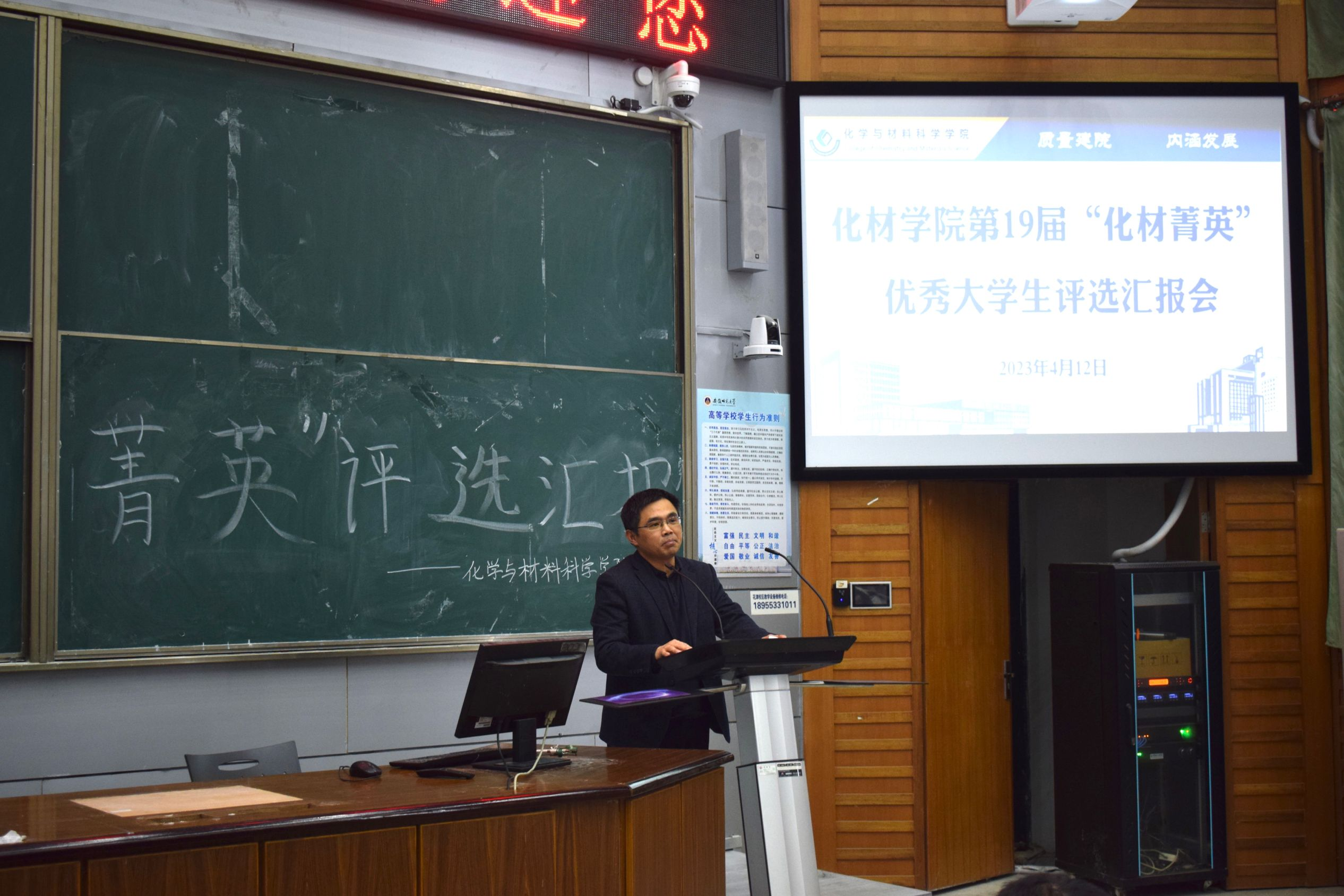 于4月12日晚在教学楼2010105教室举办第19届“化材菁英”优秀大学生评选活动。学院党委副书记李古州、材化系主任黄玉成、化工系主任周映华、化学系主任陈郑、全体专兼职辅导员以及各年级学生代表参加评选活动。