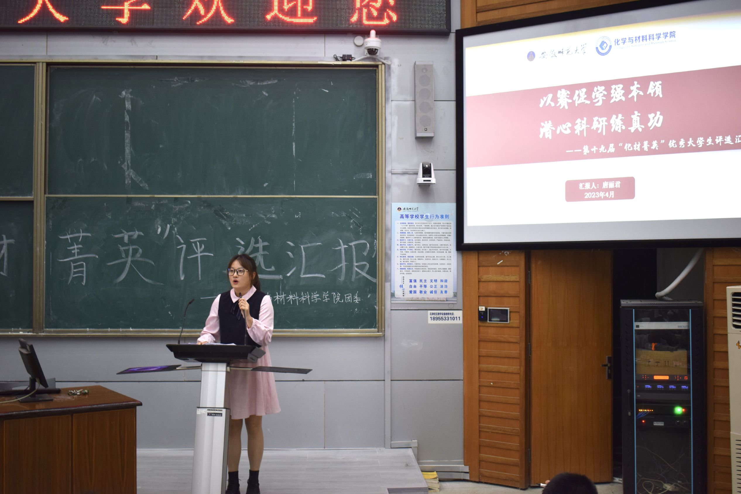 通过前期的广泛宣传、学生报名、班级推荐、材料审核,本次共有16名优秀大学生候选人参与评选。参选学生从学风创优到志愿服务,从科技创新到文体活动分别进行汇报,充分彰显了各自的独特优势和魅力。2019级应用化学专业吴泓婧乐于奉献,积极参加校内校外的各种志愿服务,从疫情防控到科普志愿服务,累计志愿时长达500小时,作为校研支团成员即将奔赴祖国西部支教;2019级材料化学专业唐丽君以赛促学强本领,科研路上炼真功,躬行实践,以第一作者发表SCI论文一篇,带领团队在科技竞赛中斩获国家级奖项;2019级化学师范专业林曦笃学求是,精勤不倦,大学四年学业成绩和综合测评均排名专业第一,荣获国家奖学金,积极弘扬优良学风,现以保送至中国科学技术大学攻读研究生。