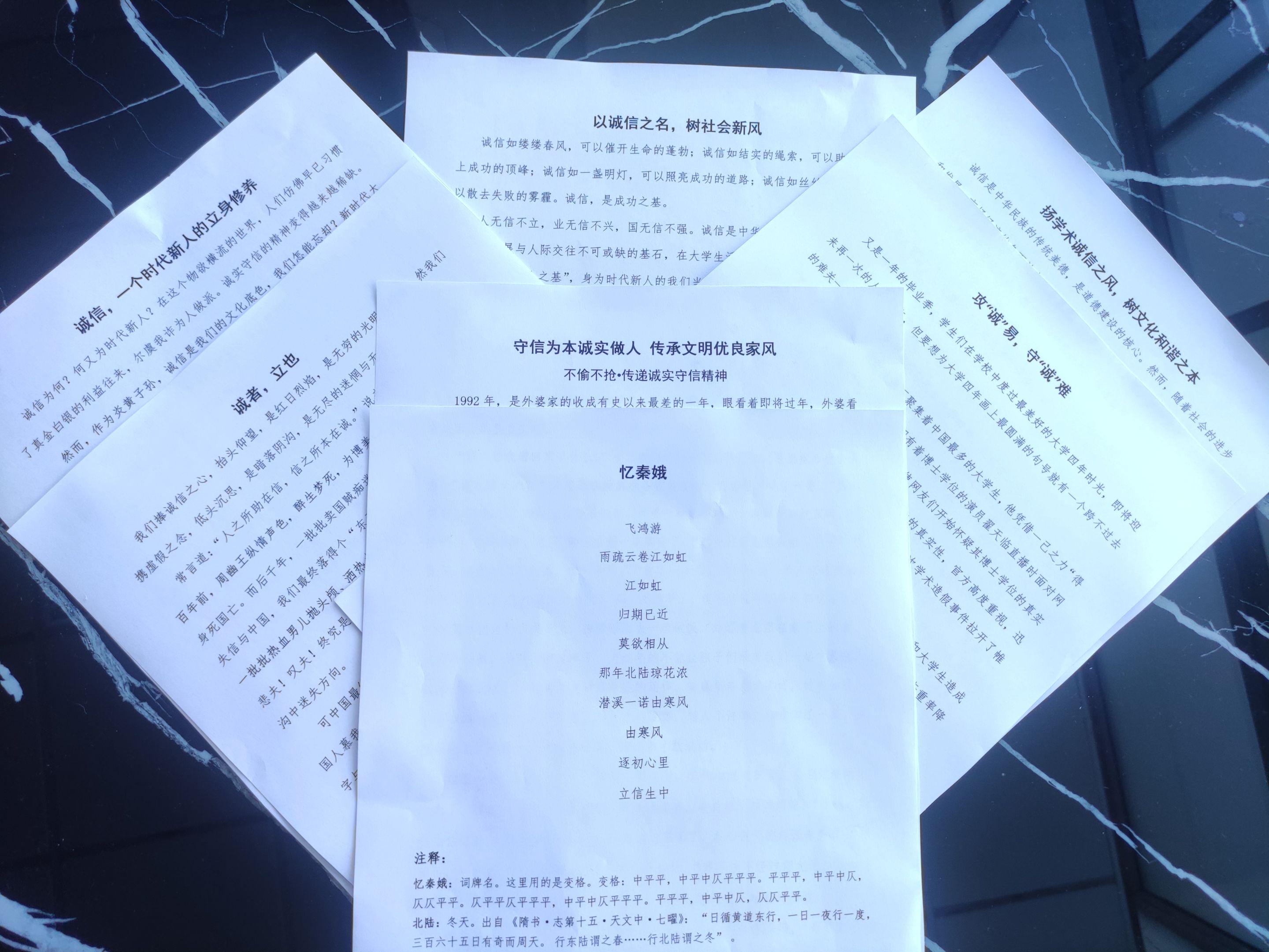 诚信征文,感恩奋进树信念。学院组织开展“持诚信在心,揽风月于怀”的主题征文比赛。此次征文活动,广泛征集“诚信家风”“诚信交友”“诚以立身”“诚信就业”“学术诚信”“诚信还贷”等方面的事迹、故事。诚信自古以来就是我国传统美德,将诚信故事和诚信观念根植于内心本就是当代大学生应该做的一件平凡而意义深远的举动。通过这次活动,加强了我院学生诚信教育、促使我院学生树立诚信观念,培养诚信品质,提高我院学生综合素质,形成有广度、有深度、有社会影响力的诚信精神。