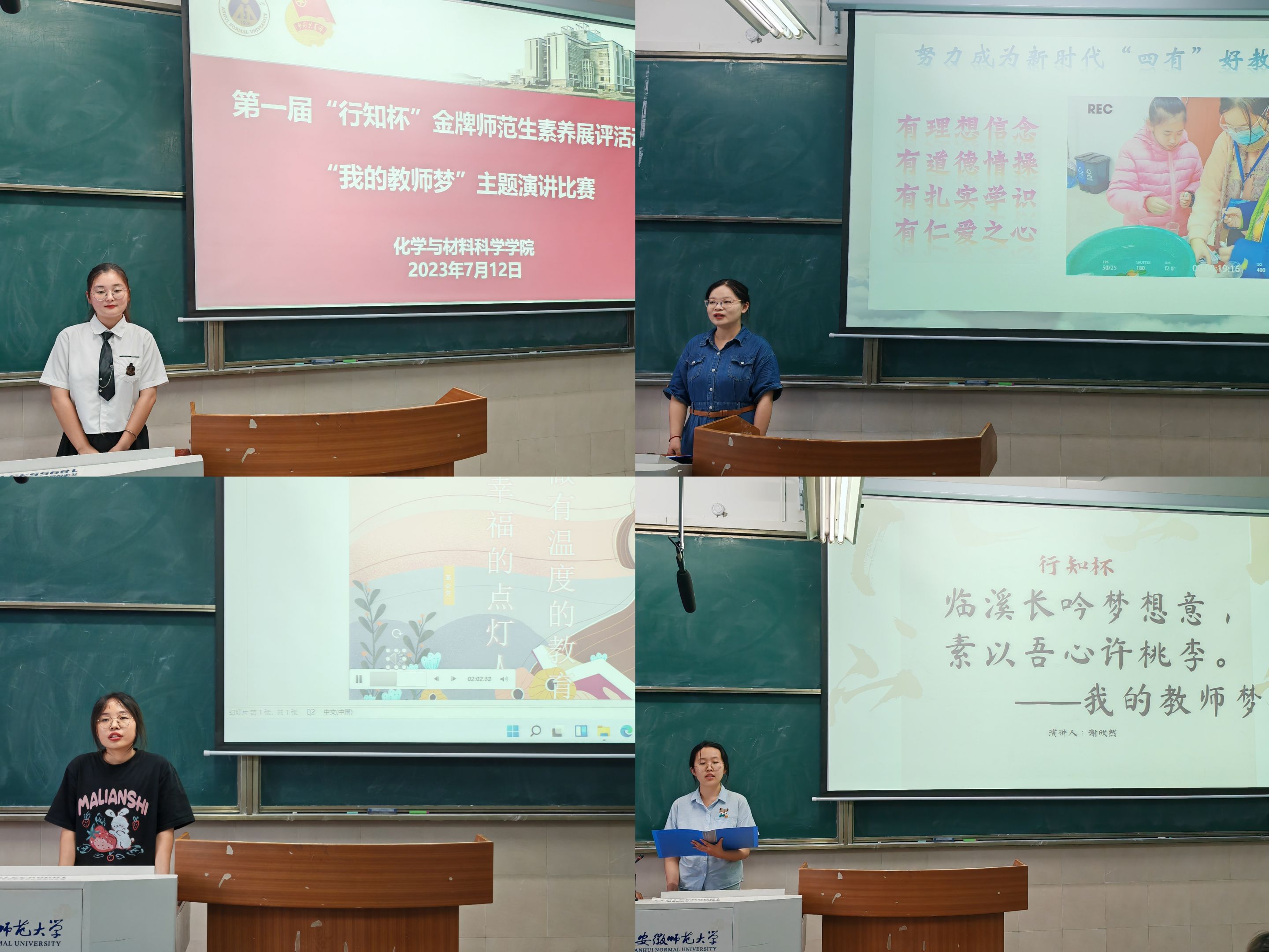 在教学楼5号楼301、302教室举行首届“行知杯”金牌师范生素养展评活动决赛。化学系阙荣辉、程瑶琴老师,化工系许发功老师,辅导员陶勇、陈静、王芳、王霞、付娜出席活动并担任评委。活动由学院团委书记梅冠东主持。