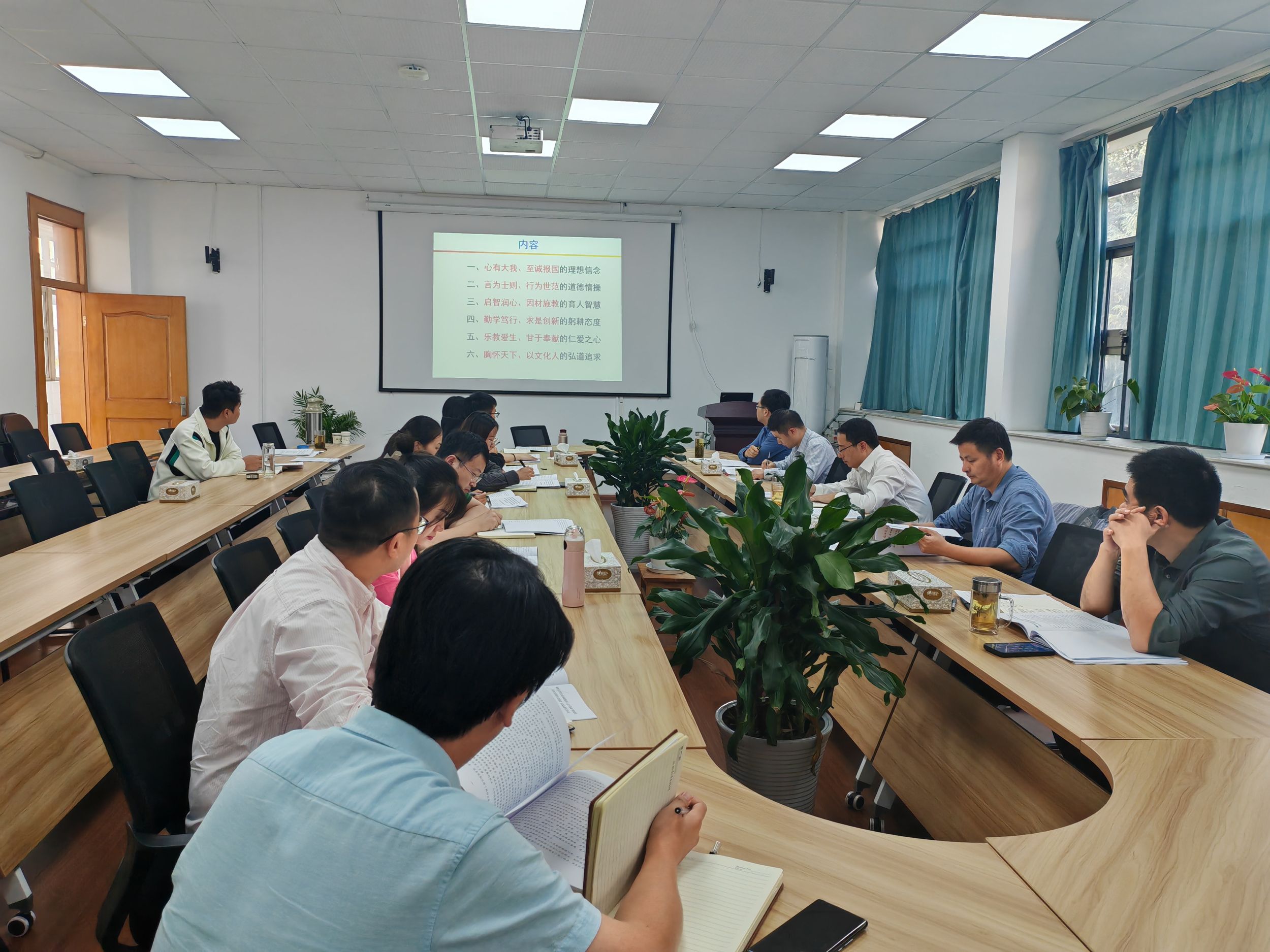 与会人员以观看新闻视频的方式集体学习了习近平总书记在浙江和黑龙江等地考察时的重要讲话精神,集体学习了习近平总书记给全国优秀教师代表的致信和安徽省潜山野寨中学新考取军校的同学们的回信精神。汪俊武领学了习近平总书记在《求是》发表的重要文章《推进中国式现代化需要处理好若干重大关系》,李古州传达了中央纪委国家监委、安徽省纪委监委公开通报的违反中央八项规定精神典型问题和安徽省委教育工委通报的师德师风典型案例,周双六领学了习近平总书记给东北大学全体师生回信精神和习近平总书记重要文章《扎实推动教育强国建设》,王波涛领学省委书记韩俊在全省生态环境保护大会上的重要讲话精神。学院教学副院长方臻以“弘扬教育家精神,努力培养党和人民满意的‘四有’好老师”为主题,结合实际,从理想信念、道德情操、育人智慧、躬耕态度、仁爱之心、弘道追求等六个方面,对教育家精神作了解读阐释,并开展研讨。