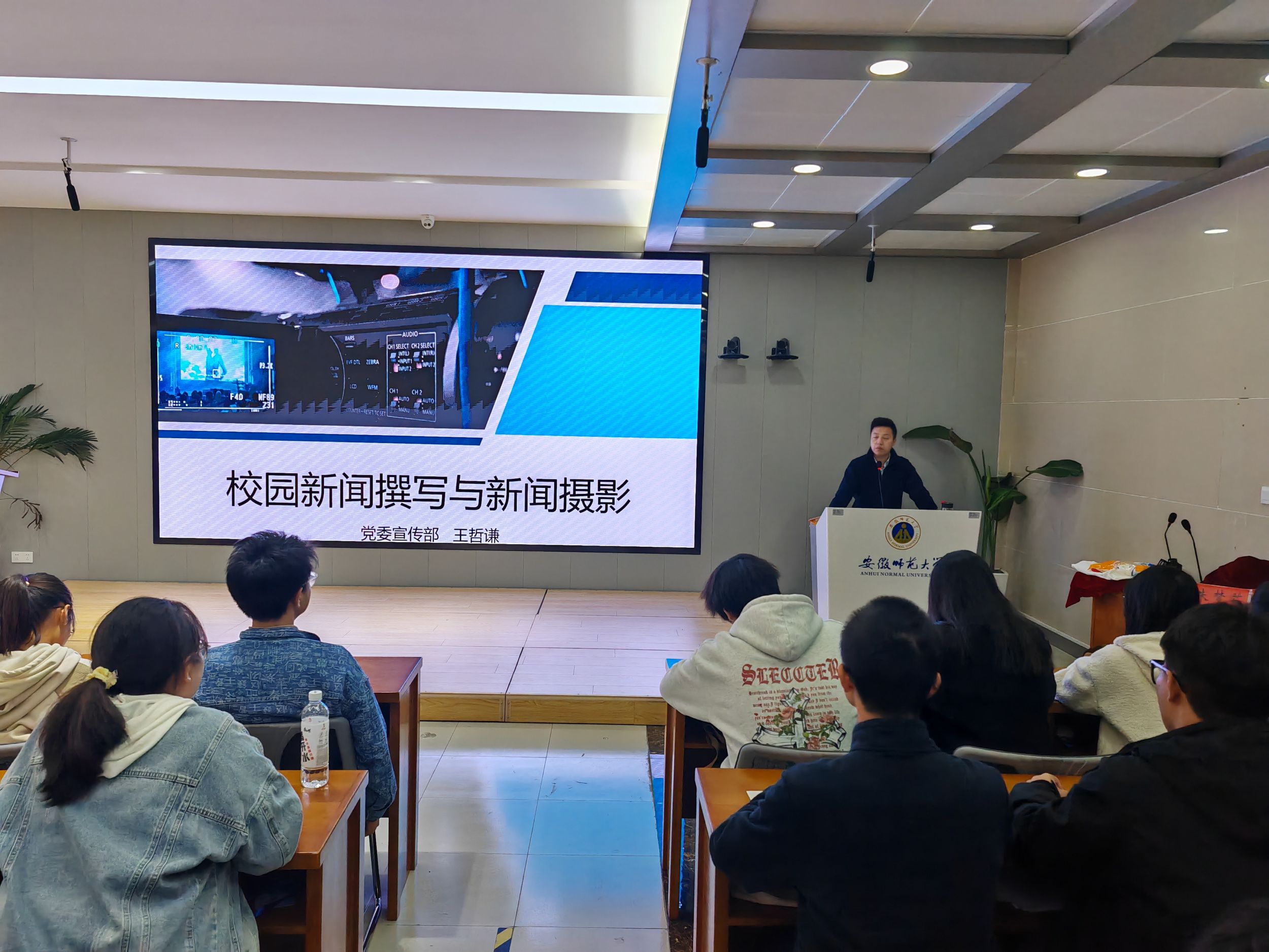 夯实理论基础,提高工作能力。为提升同学们的新闻写作能力及摄影技巧,校党委宣传部新闻宣传科副科长王哲谦为同学们讲解校园新闻和新闻摄影的相关知识。他从新闻的定义出发,对新闻价值、新闻与宣传的关系等内容进行了全面讲解,通过讲述新闻策划和撰写新闻稿件的基本方法,介绍了新闻消息不同的文体和分别对应的写作方法,并且结合实际案例,传授了新闻拍摄的技巧手法。在场学员围绕培训内容积极踊跃进行提问,王哲谦结合实际事例为大家答疑解惑。