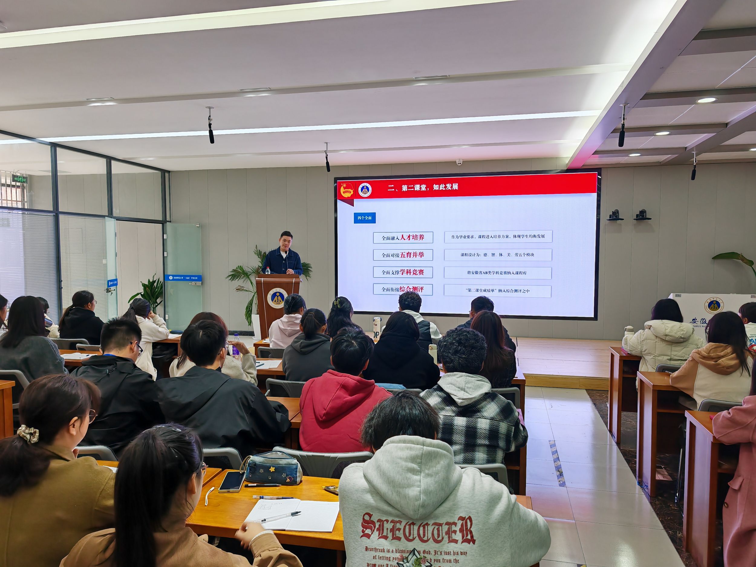 提高“二课”教育,共筑创新活力。校团委素拓部副部长王申振从“第二课堂成绩单”讲起,围绕人才培养,五育并举,学科竞赛,综合测评四个维度向同学们解答学分相关的问题。他强调,“第二课堂成绩单”是学校人才培养体系的重要模块,也是同学们政治锤炼、理论实践、技能拓展、素质养成的载体平台。随后,王申振重点介绍了“挑战杯”大学生创业计划竞赛的有关情况,进一步加深了学员们对学科竞赛的认知,鼓励同学们在参与学科竞赛、科技创新等方面发挥带头示范作用,在学院上下营造优良学风。