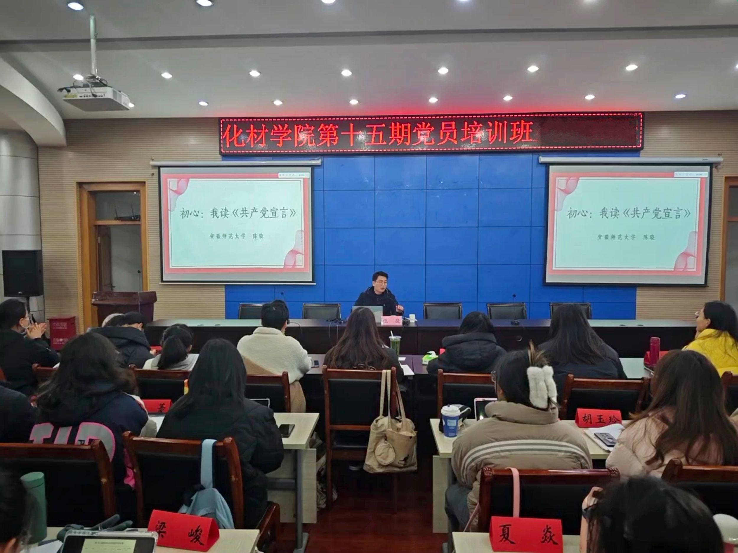 校团委副书记陈骁为培训班学员讲授《初心:我读<共产党宣言>》,他从《共产党宣言》和安徽师范大学的联系和其重要意义入题,提出两个深刻的问题:《共产党宣言》说了什么?又为什么伟大?而寻找答案的过程就如陈望道翻译《共产党宣言》的过程——“真理的味道有点甜!”。希望全体党员要严格自我要求,在未来的学习和生活中积极发挥先锋模范带头作用。