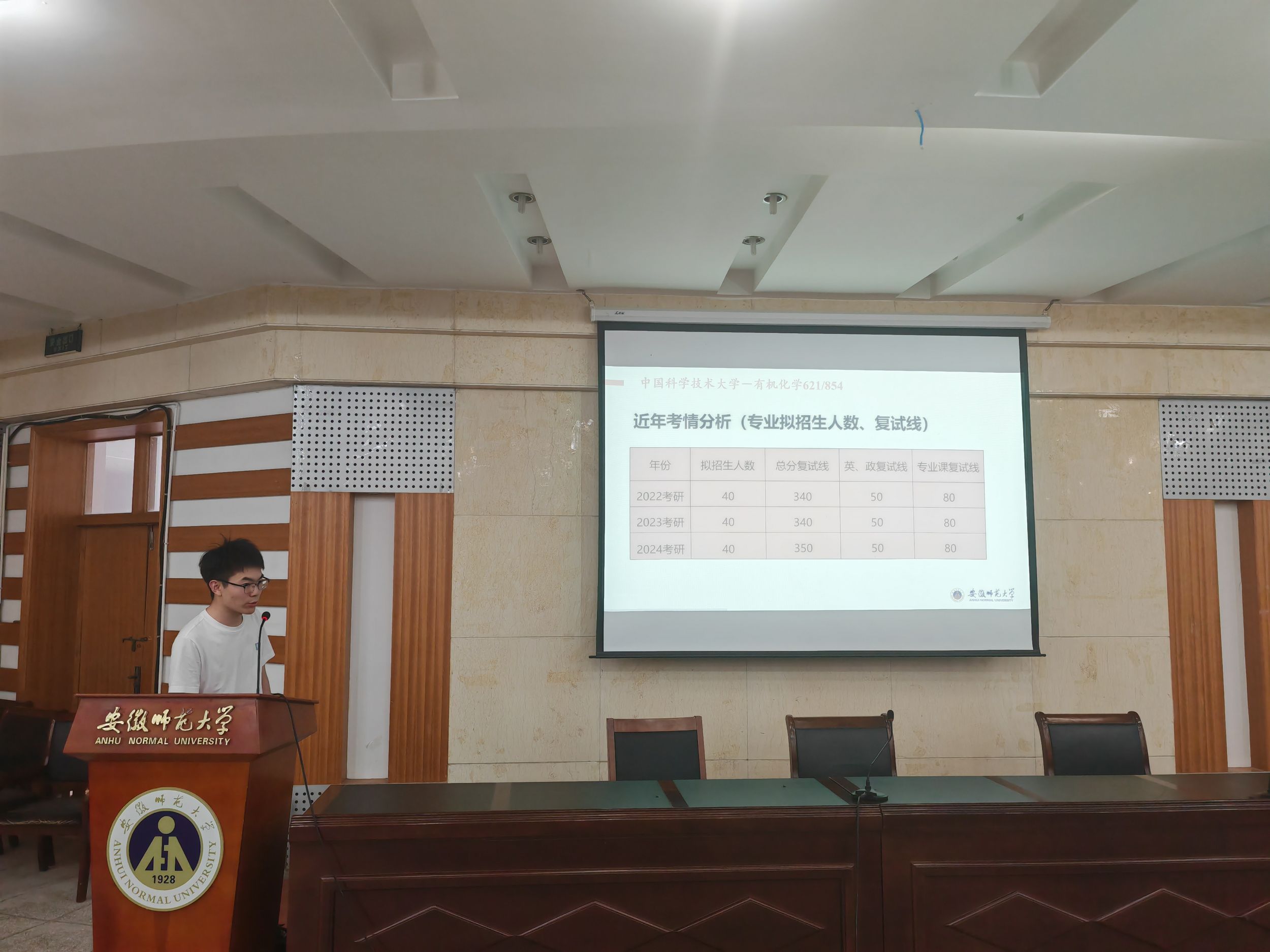 在考研经验交流会环节,2020级材料化学胡博同学从考研择校、备考经验和调剂经验三个方面进行了分享,结合自身考研情况,认真详细地说明了如何选择适合自己的学校以及备考时如何平衡学习和生活等相关事宜。2020级化学(师范)专业邵娴雅同学从自己的备考经历出发,详细介绍了公共课和专业课的考研经验,并表明考研期间要抓细节、做事要落到实处,强调了好身体、好心情是革命的本钱,鼓励同学们相信自己,坚定自己的选择。2020级应用化学李硕同学更为详细地介绍了每个科目的备考建议,告诫同学们要重视物化题目的计算过程,不要眼高手低,同时建议同学们进行合理的时间规划和任务安排,最后还为同学们所困扰的问题进行了答疑。
