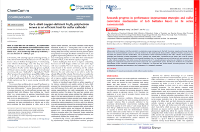 结合个人研究兴趣,他毅然决然选择电化学储能领域,继续深入研究电池奇妙且复杂的机制,以“新能源”作为未来的职业方向。他目标明确,合理安排时间,并以此为动力,坚持每天前往实验室进行科研课题的研究。与此同时,导师的严格要求使他不断积累,学习了丰富的科研技能,提升了技能水平。目前,已在国际期刊Chemical Communication(Q2/IF=4.9)中以第二作者(导师一作)发表SCI论文一篇(Core-shell oxygen-deficient Fe2O3 polyhedron serves as an efficient host for sulfur cathode),于2024年以第一作者身份在国际期刊Nano Research(Q1/IF=9.9)当中发表综述论文一篇,(Research progress in performance improvement strategies and sulfur conversion mechanisms of Li-S batteries based on Fe series nanomaterials)。