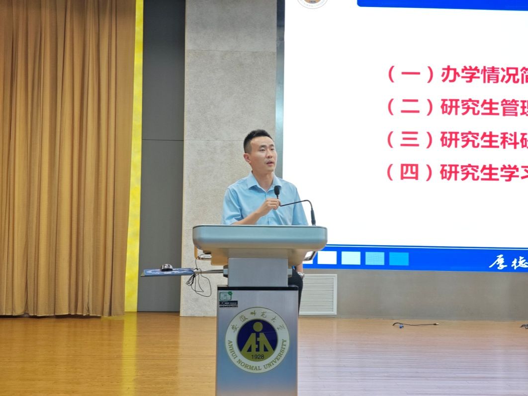 硬件条件和人才培养成效。随后,陈郑解读了《安徽师范大学研究生学籍管理方法》和《研究生科研实验室安全》等相关内容,通过各高校实验室安全事故事例再次强调实验室安全的重要性。此外,陈郑希望2024级研究生做好角色转变,远离舒适圈,要做到学术诚信,不存在侥幸心理,同时做好自我管理,注意实验室安全。