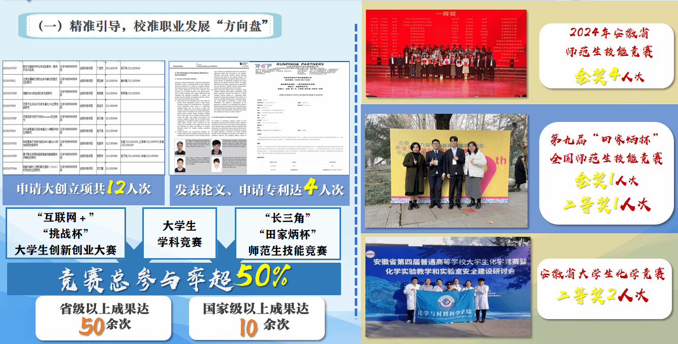 精准引导,校准职业发展“方向盘”。班级首届金牌、银牌师范生总数达34人;大创立项12项,发表论文申请专利4人次,竞赛总参与率超50%,获省级以上奖项50余次。