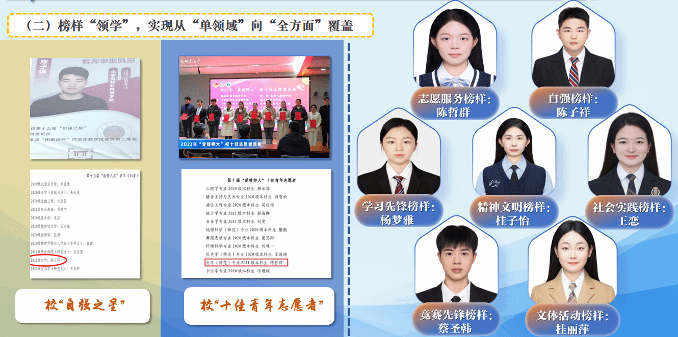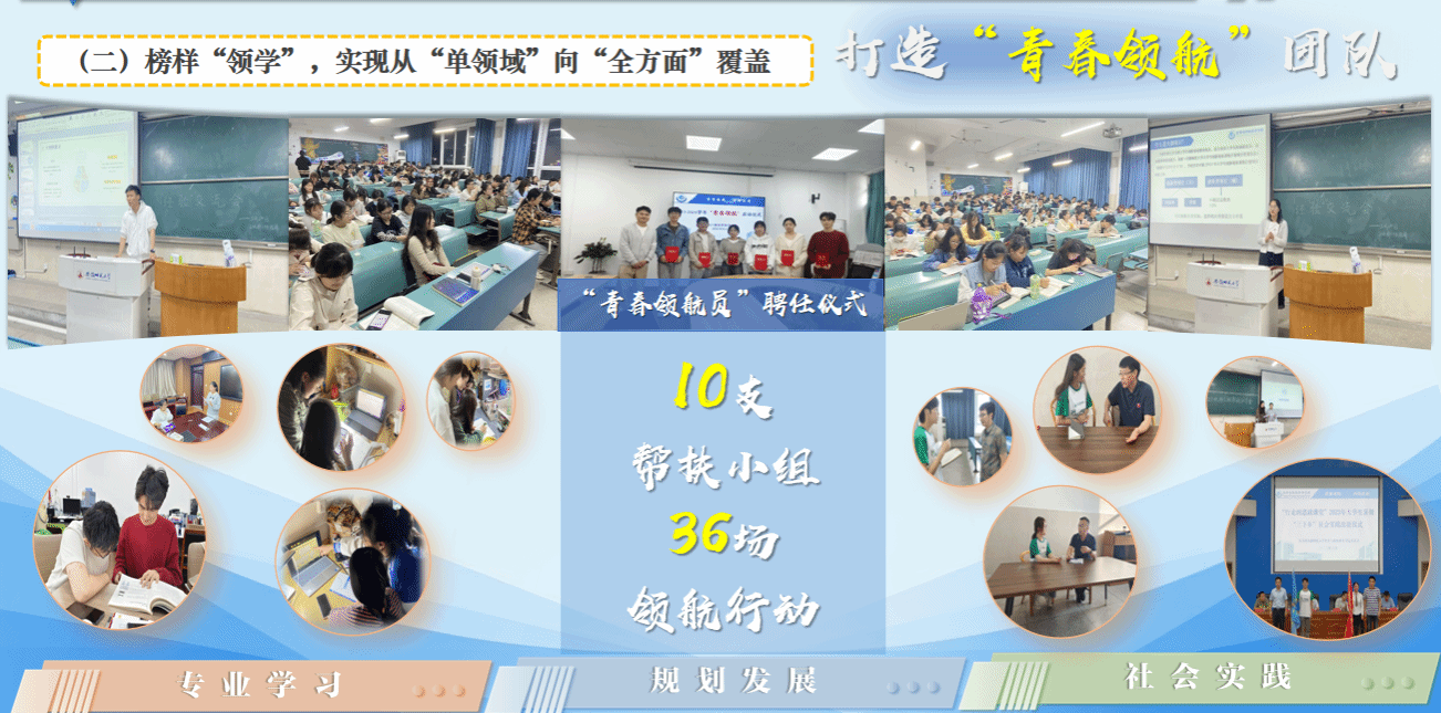 榜样“领学”,实现从“单领域”向“全方面”覆盖。班级涌现出多名院“优秀大学生”、校“自强之星”、校“十佳青年志愿者”等多名“榜样领航员”,组建“青春领航”团队,自活动开展以来,累计组建10支帮扶小组,开展“领航行动”36场次。