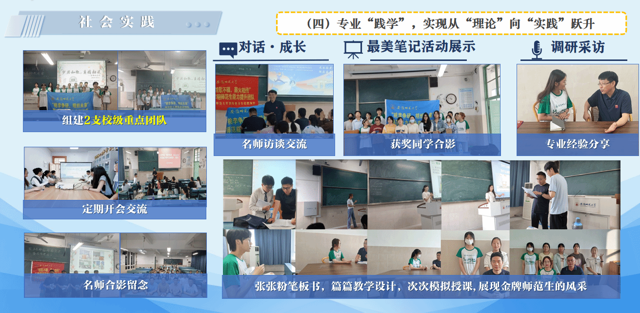 专业“践学”,实现从“理论”向“实践”跃升。首届小学期,班级同学组建2支校级重点团队,在实践中不断锤炼专业技能,立志做有扎实学识的师范生;三个月的教育实习,班级同学以教育家精神诠释师者本色,携手共进,展现金牌师范生的风采!