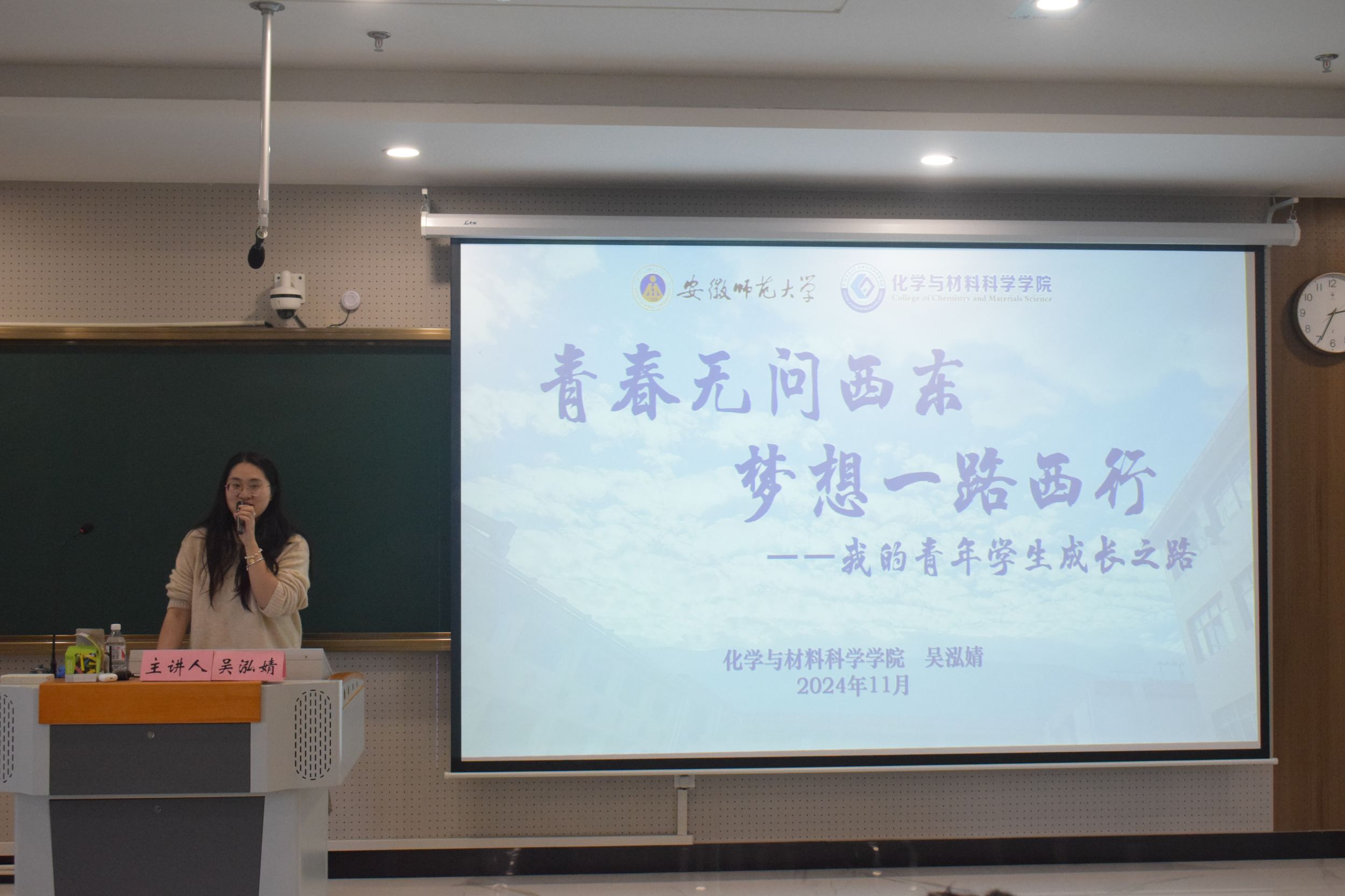 校第25届研支团志愿者、化学专业2024级研究生吴泓婧以“青春无问西东,梦想一路西行”为主题,介绍了自己作为学团骨干和研究生支教团成员期间的经验与感悟,分享了个人成长事迹。在学生干部方面,她结合自身多学生干部的经验,建议学弟学妹们沉下心、弯下腰,积极主动地为同学们服务,在实践中提升个人能力。在支教团经历分享中,她深情讲述了自己在四川省普格县支教过程中的所见所闻、所思所感,以及这段经历给自己带来的成长与收获,让同学们深刻感受到了奉献的力量和责任的重大。在讲座的最后,她送给同学们一段话:“在三尺讲台上助力学生成长,用主题团课讲好新时代故事,用热情和耐心温暖少数民族学子心灵,用实际行动诠释当代青年的责任与担当!”