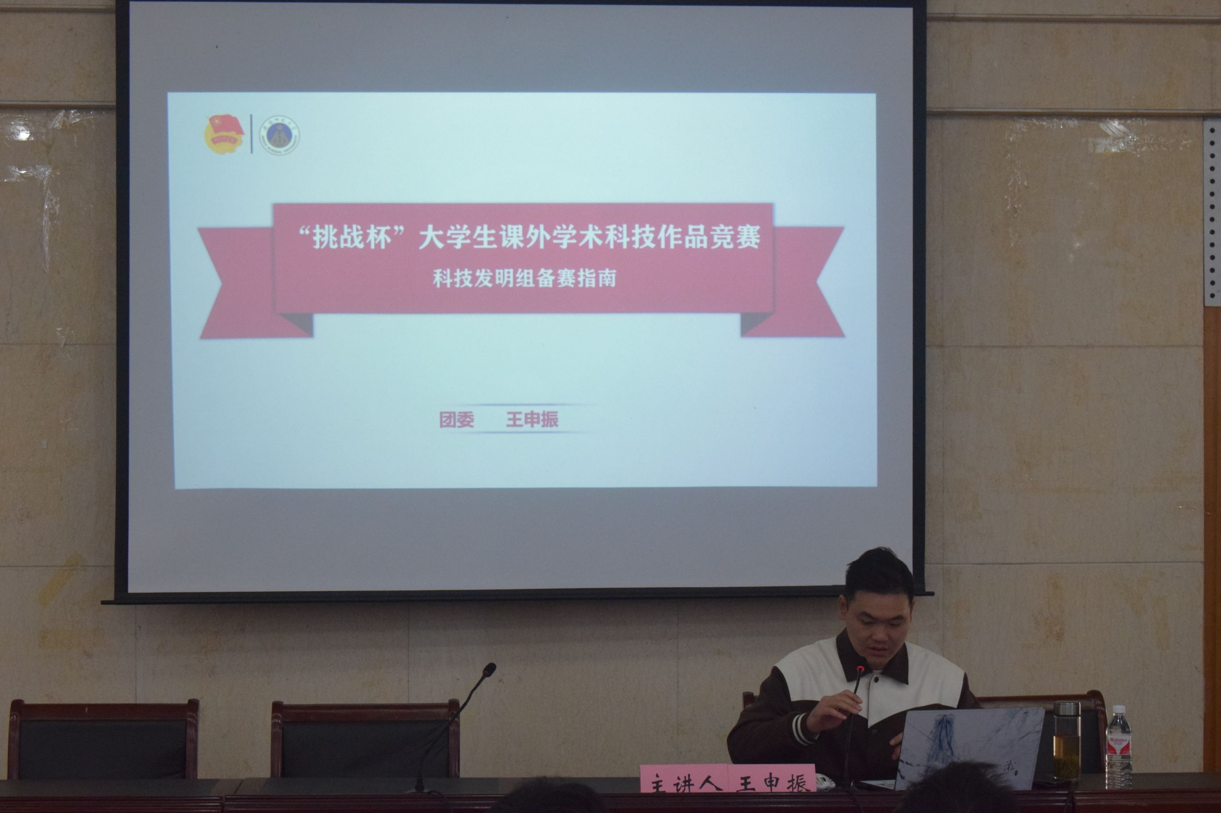 校团委素质拓展部王申振老师就“挑战杯”大学生课外学术科技作品竞赛(科技发明组)为同学们带来了详细的参赛指导。王申振首先介绍挑战杯在培养学生创新能力和实践能力方面的重要意义,之后以如何选题,如何撰写研究报告,如何制作PPT三个方面介绍竞赛注意事项。他着重强调了团队建设的重要性,鼓励同学们在组队时充分考虑成员的专业背景、技能特长等因素,打造一支优势互补的团队。最后,以“挑战挑战,突破自我”结尾,表达了对化材学子的期望。