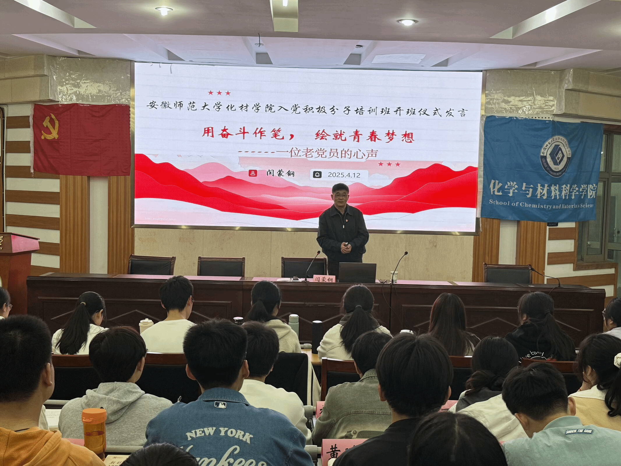 闫蒙钢以《用奋斗作笔,绘就青春梦想——一位老党员的心声》为题,结合“我的追梦之旅”与“寻找青春榜样”两部分内容,从递交入党申请书的青年时期,到成为正式党员的教师生涯,展示了他从教数十年来的点点滴滴。一篇篇泛黄的日记、一张张动人的照片,都承载着他“勤耕常新,乐在其中”的人生格言。“先做绿色的梦,才有金色的秋”,他希望同学们能坚定理想信念,做好生涯规划,早日成为一名为国家、为社会、为人民积极奉献、创造价值的优秀人才。