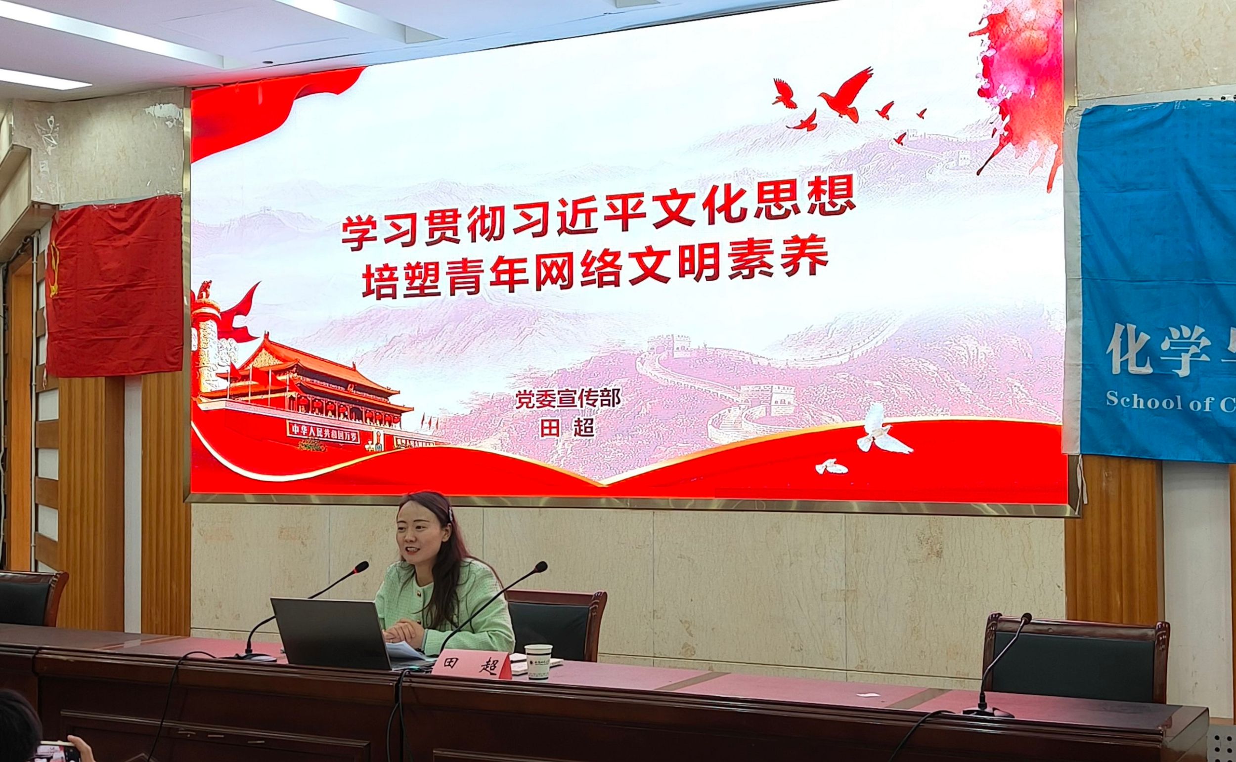 党委宣传部副部长田超以《学习贯彻习近平文化思想,培塑青年网络文明素养》为主题,从习近平文化思想的形成过程、深刻认识习近平文化思想的重大意义、网络不文明行为浅析、新时代大学生善于“用网”四个方面进行深刻阐述。她指出,作为新时代的青年,要肩负起时代赋予的使命,在网络世界中展现出良好的精神风貌和道德品质,为营造清朗的网络空间贡献自己的力量。