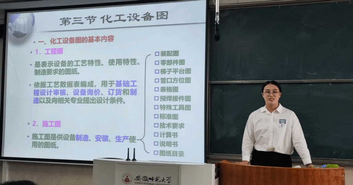 本节课教学重点是“化工设备图绘制”专题。课程伊始,梁俊老师通过启发式提问引导学生回顾标准设备与非标准设备的核心差异,巧妙串联多学科知识,将化工原理、反应工程、热力学等多学科理论融入设备选型和设计参数(如泵的流量扬程、风机的风量风压)的推导过程,既训练了学生跨学科整合能力,又深化了其工程思维的系统性。随后梁俊老师通过展示化工设备图,依次介绍了设备图中“三表一图一栏”所包含的具体内容,采用“图例解剖-内容阐释-实践关联”的递进模式,带领同学们一步步抽丝剥茧般解读知识点,加快了同学们的理解进程,加固了对知识点的掌握。并借助“多次旋转画法”、“夸大画法”、“断开分层画法”、“单线图画法”等特色技法演示,使抽象图纸跃然眼前,更以“薄涂层与厚涂层差异辨析”等案例实现了知识的可视化。梁俊老师巧妙运用“知识锚点-工程实践-社会价值”三维渗透法,将严谨治学态度、工程伦理意识凝练于装配图规范标注中,将团队协作精神熔铸于装配图协同设计环节,使学生在解码图纸符号体系时,同步建构起"技术精度与人文温度共生的职业价值观,让同学们寓教于乐,在知识的海洋中徜徉。