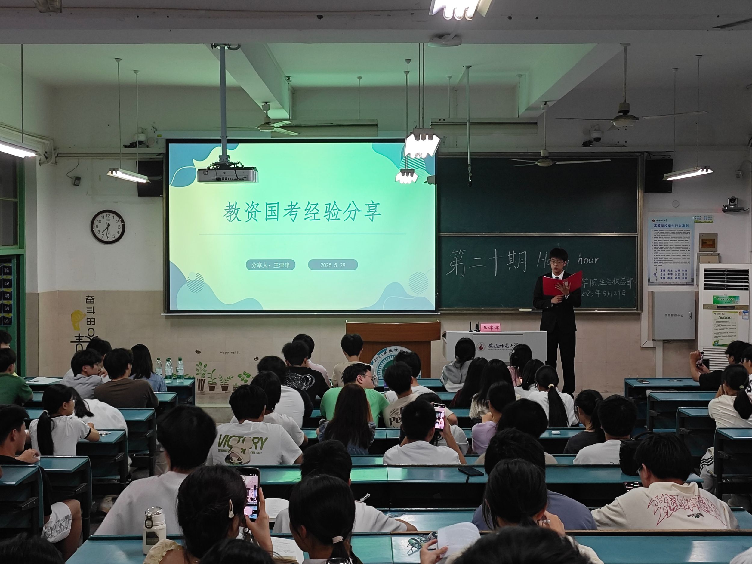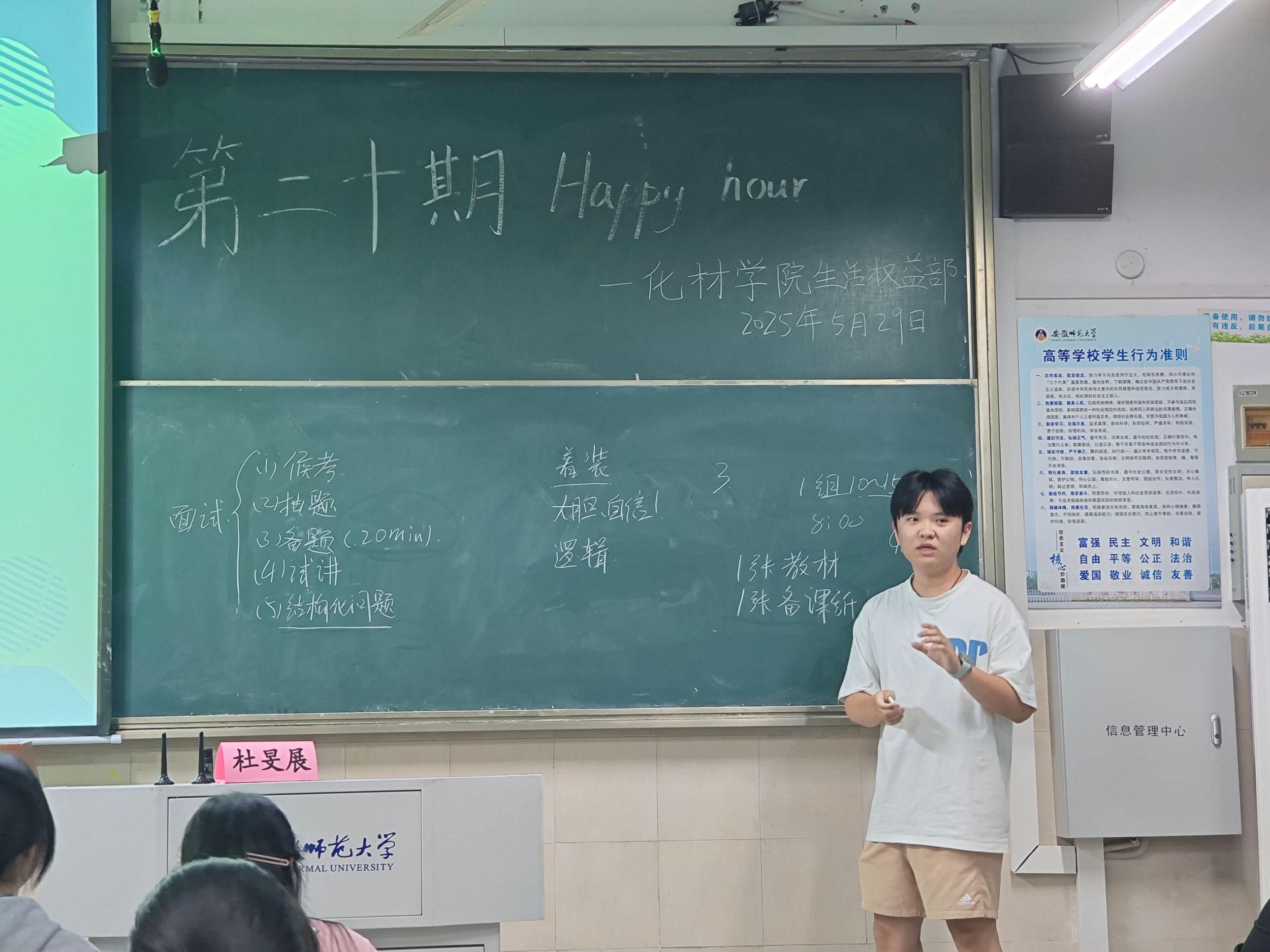 5月29日晚,第二十期Happy Hour——化语茶室特色活动如期开展。活动中,22级应用化学专业王津津和22级化学师范专业杜旻展结合专业知识,从自身经历出发,讲述了师范生和非师范生分别在教资备考过程中的注意事项和具体建议。互动环节中,同学们踊跃提问,宣讲人耐心解答,现场不时响起热烈的掌声。这场兼具专业性与亲和力的宣讲,让同学们在聆听与交流中汲取心理成长的力量,进一步提升了心理健康素养。