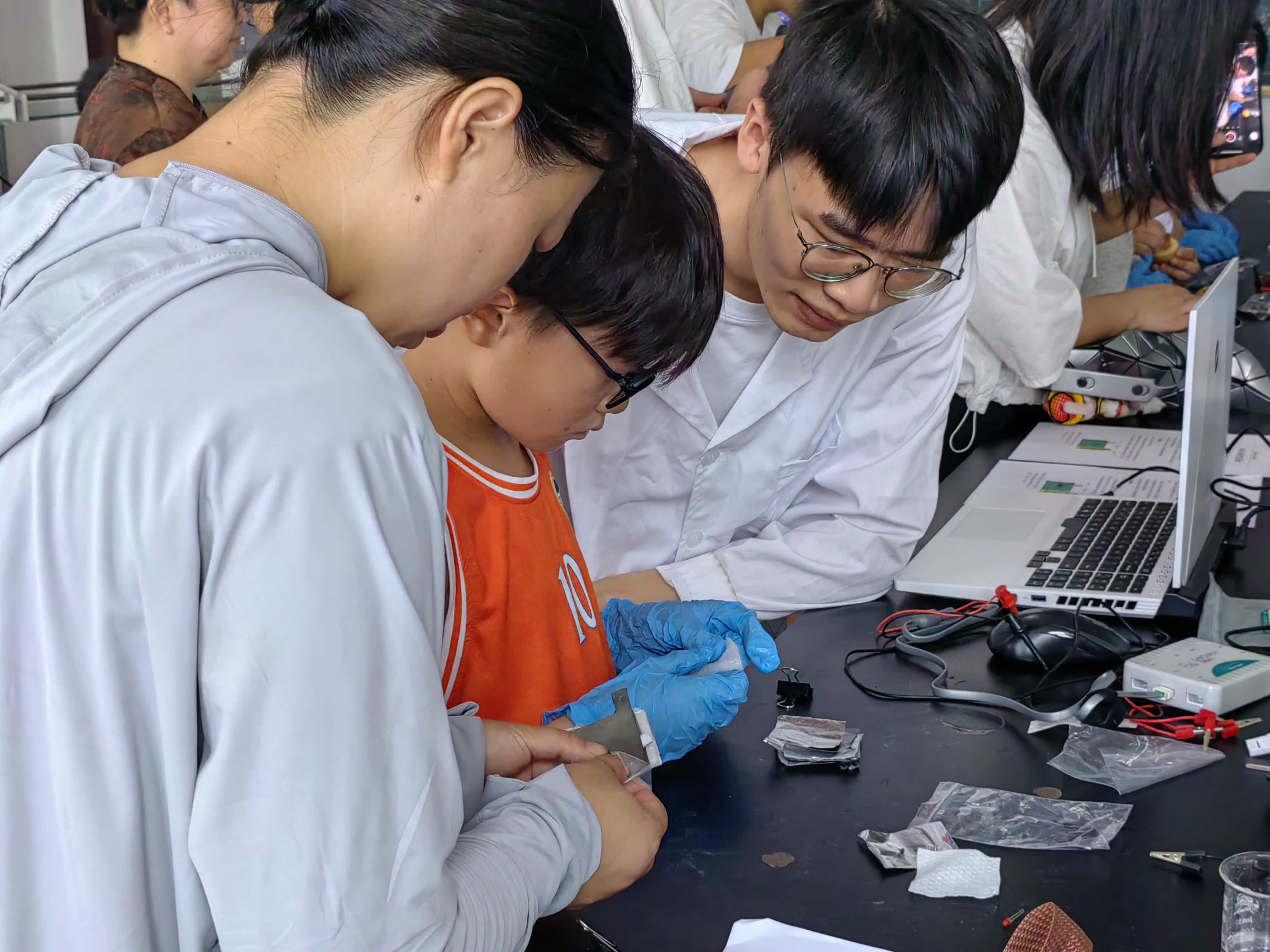 9 月 7 日上午,面向生物、化学、物理三个专业的大学生,活动更注重学科深度,参与者借助电压、电流传感器,实时采集纸电池、水果电池的实验数据,数据经专业软件生成动态曲线,将 “看不见” 的电流电压变化过程清晰具象化。
