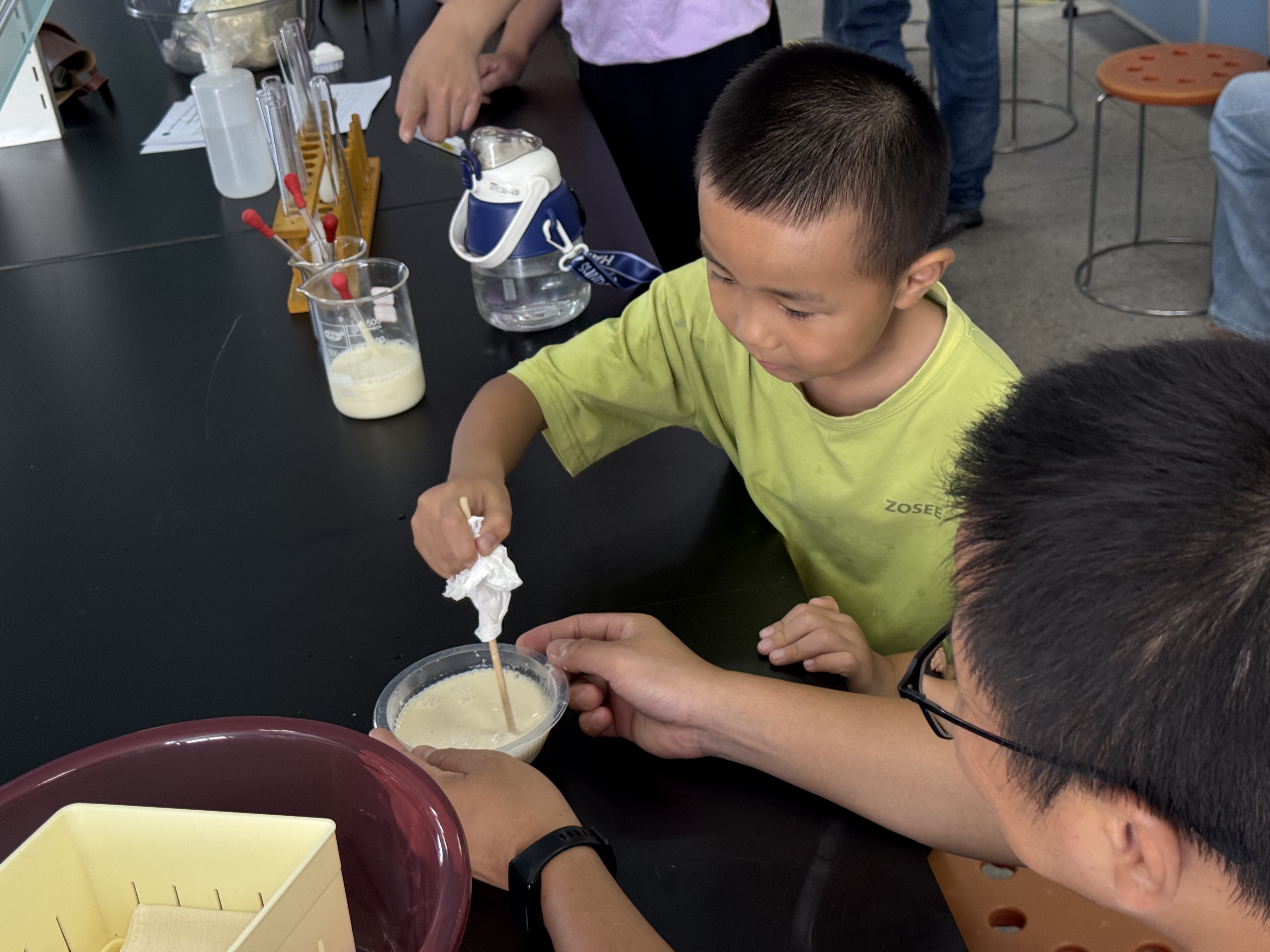 实践环节里,孩子们化身 “非遗小匠人”,完整体验黄豆 “变身” 豆腐的全流程:泡豆时观察黄豆吸水膨胀的变化,磨豆时感受颗粒到细腻的蜕变,滤渣时分离豆浆与豆渣,煮浆时紧盯翻滚的泡沫,点浆时屏息等待凝固,压制时小心塑造豆腐形态。当手电筒光束穿透豆浆形成清晰光路,孩子们惊呼 “像魔法”—— 丁达尔效应的直观呈现,让抽象的科学概念变得可感可知。