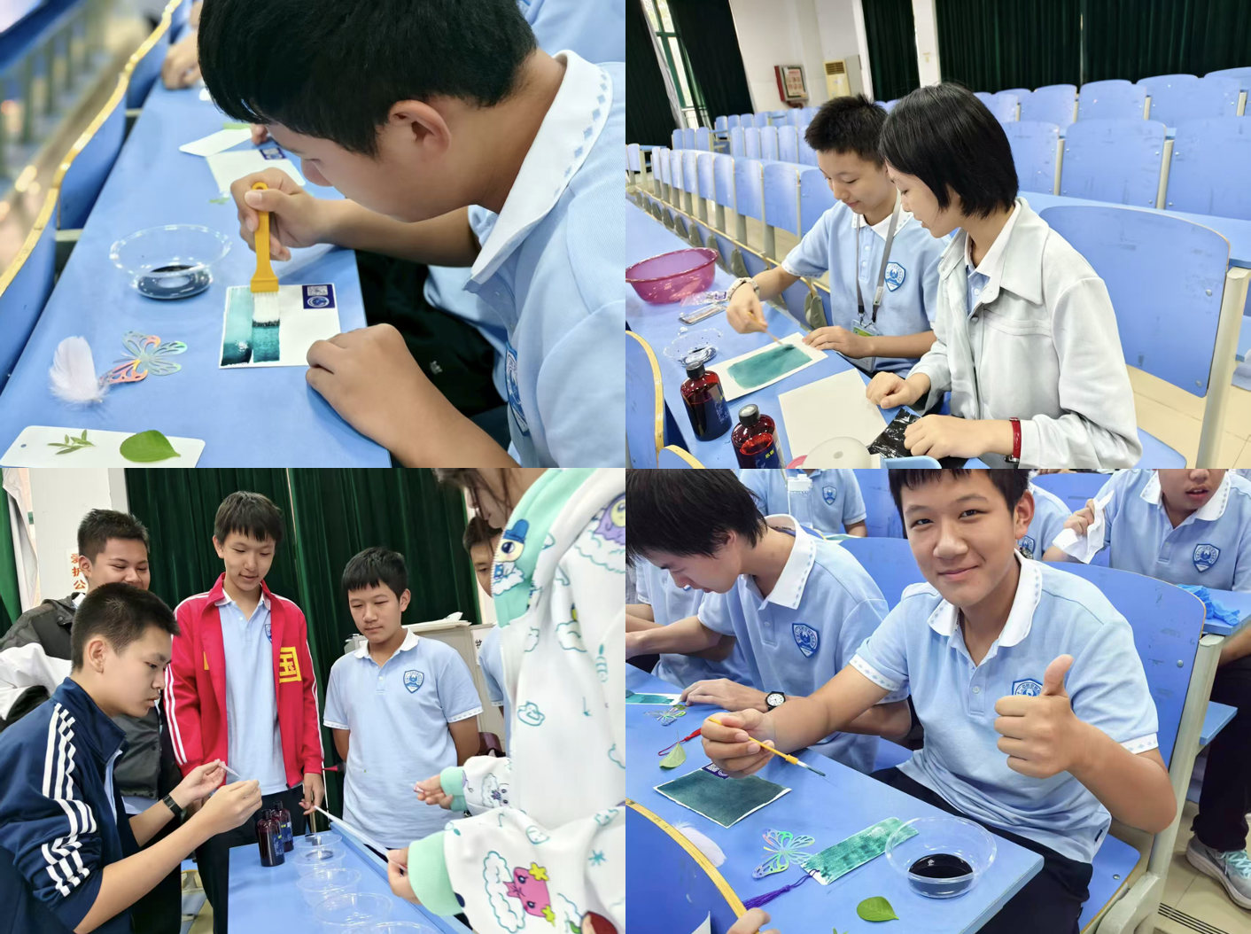 “蓝晒实验”小组则充满“艺术气息”。学生们先用滴管按1:1比例混合蓝晒液A和B,用尼龙刷均匀涂抹在专业纸上,待晾干后,放上蝴蝶、树叶、羽毛等自己喜欢的模板,用胶带固定好。活动结束后只需在阳光下晒制20分钟左右,揭下固定胶带,再放入水中漂洗,即可得到一件件“天然印染的艺术品”,在感受“光化学原理”的同时,也体验了“科技与艺术结合”的乐趣。