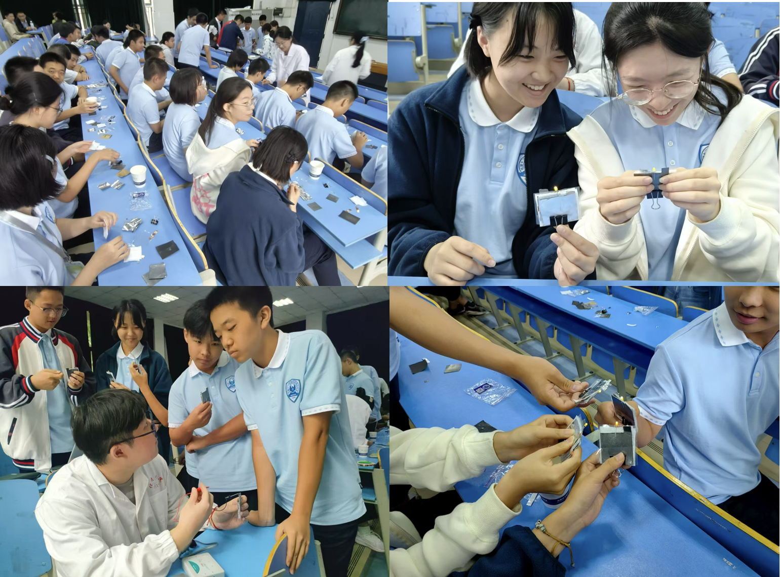 科普展演结束后,活动进入“分组实验实践”环节。42名学生分为三组,分别参与“折纸电池”“蓝晒实验”“水果电池”项目,在实践中培养动手能力、团队协作能力,更将亲手制作的“科技产品”带回家,让科普从课堂延伸到生活。