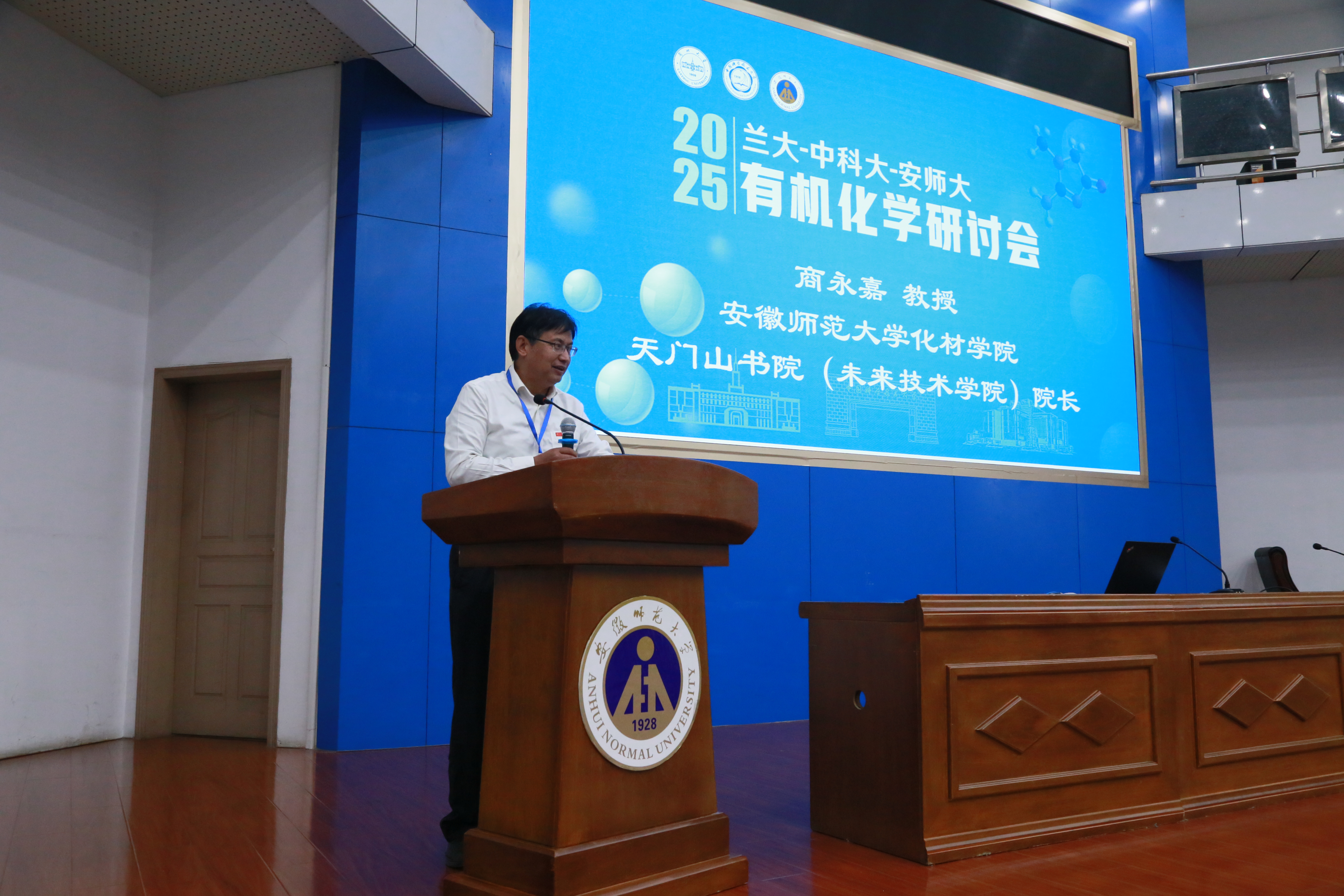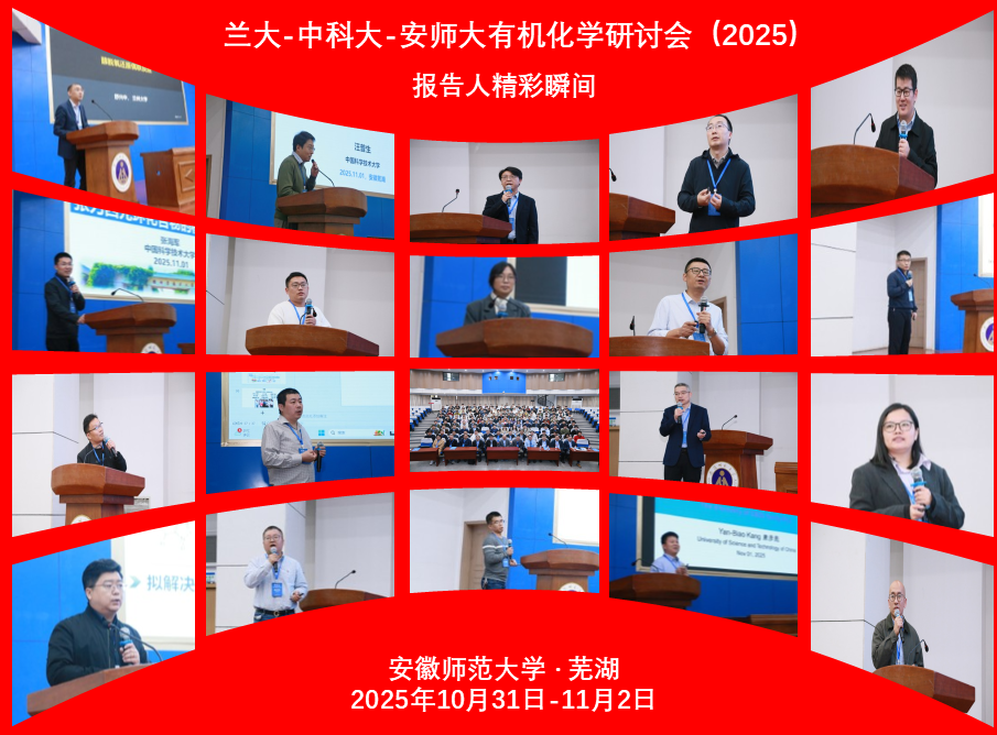 兰州大学的舒兴中、刘强、李云、刘子桐、王刚伟、谢志翔、杨彦龙老师;中国科学技术大学的汪普生、龚天军、陈殿峰、张海军、张凤莲、康彦彪老师;安徽师范大学的崔鹏、王文清、刘统信、陈曙光、张继坦、倪祁健老师分别作了题为“醇脱氧还原偶联反应”、“光诱导自由基可逆反应后续转化的调控”、“多键构筑策略的二萜天然产物全合成研究”、“分级有序无规有机共轭高分子材料与柔性器件”、“动态动力学活化氮杂及氧杂环丙烷”、“三尖杉二萜及杂萜的高效合成”、“大型真菌天然产物的生物合成及其高效挖掘”;“烃类脂肪族碳氢键不对称官能化反应研究”、“生物质平台分子增值转化研究”、“有机化学启发的聚合物精准合成:以C-H键为例”、“张力四元环的模块化合成”、“基于自旋中心转移机制的碳-杂键可控转化”、“Photochemical Degradation of PTFE”;“稀土-后过渡金属键配合物的合成及反应性”、“Stable Radical Salts Based on Nanographenes”、“无金属介导的富勒烯化学修饰”、“碳碳σ键官能团化反应研究”、“含氮杂环合成子的催化多样性转化”、“轴手性中氮茚的催化不对称合成”的学术报告。