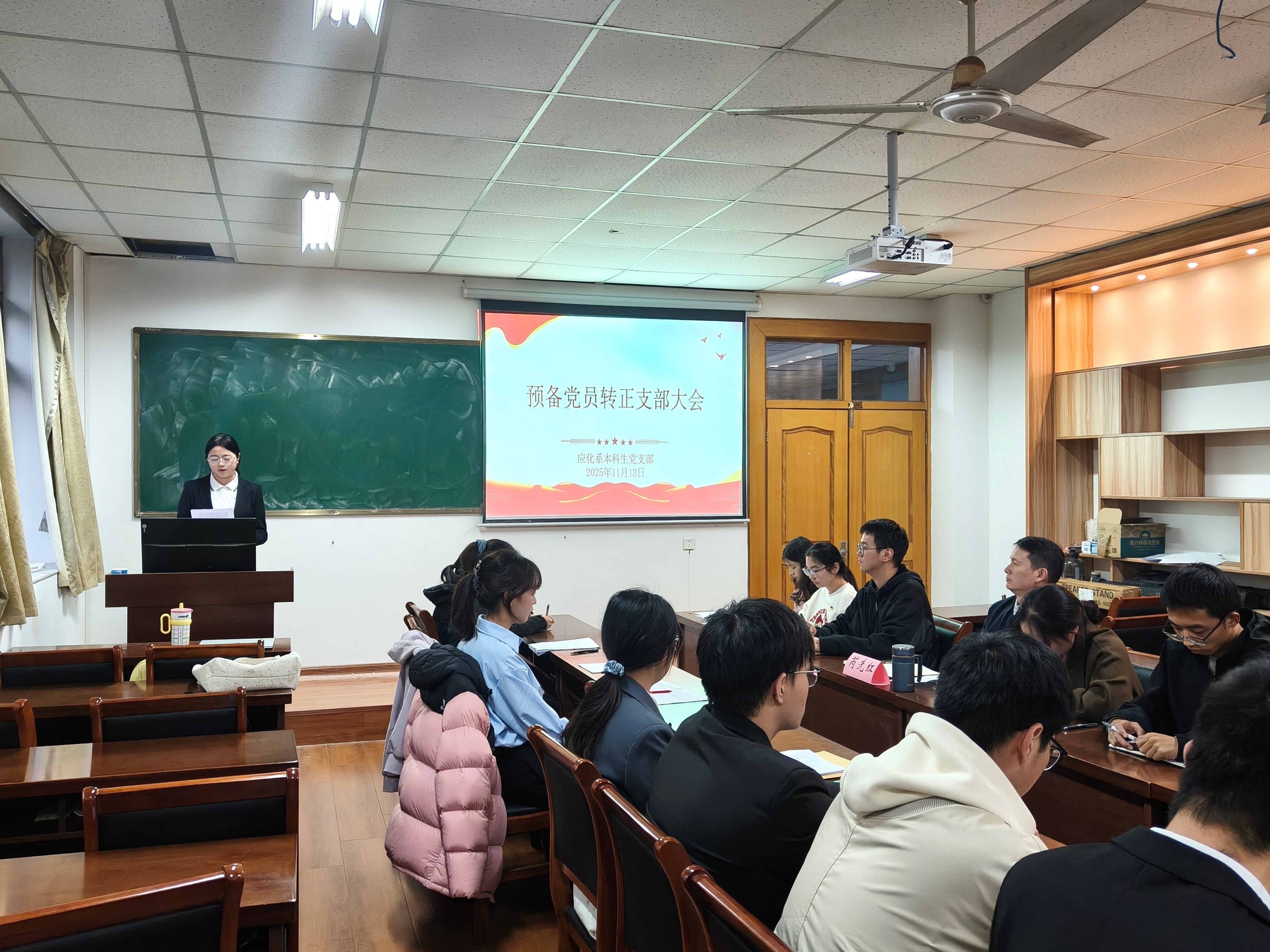 大会第三项议程,讨论左盼雅、韩雷2名预备党员转正问题,2名预备党员依次宣读个人转正申请,培养考察人分别从思想、学习、工作等方面向大会介绍了预备党员的培养考察情况,并对是否同意推荐其按时转正表明意见。与会党员充分讨论,并对预备党员提出建议。经与会正式党员投票表决,大会一致同意左盼雅、韩雷2名同志按期转正,拟提交学院党委审核。