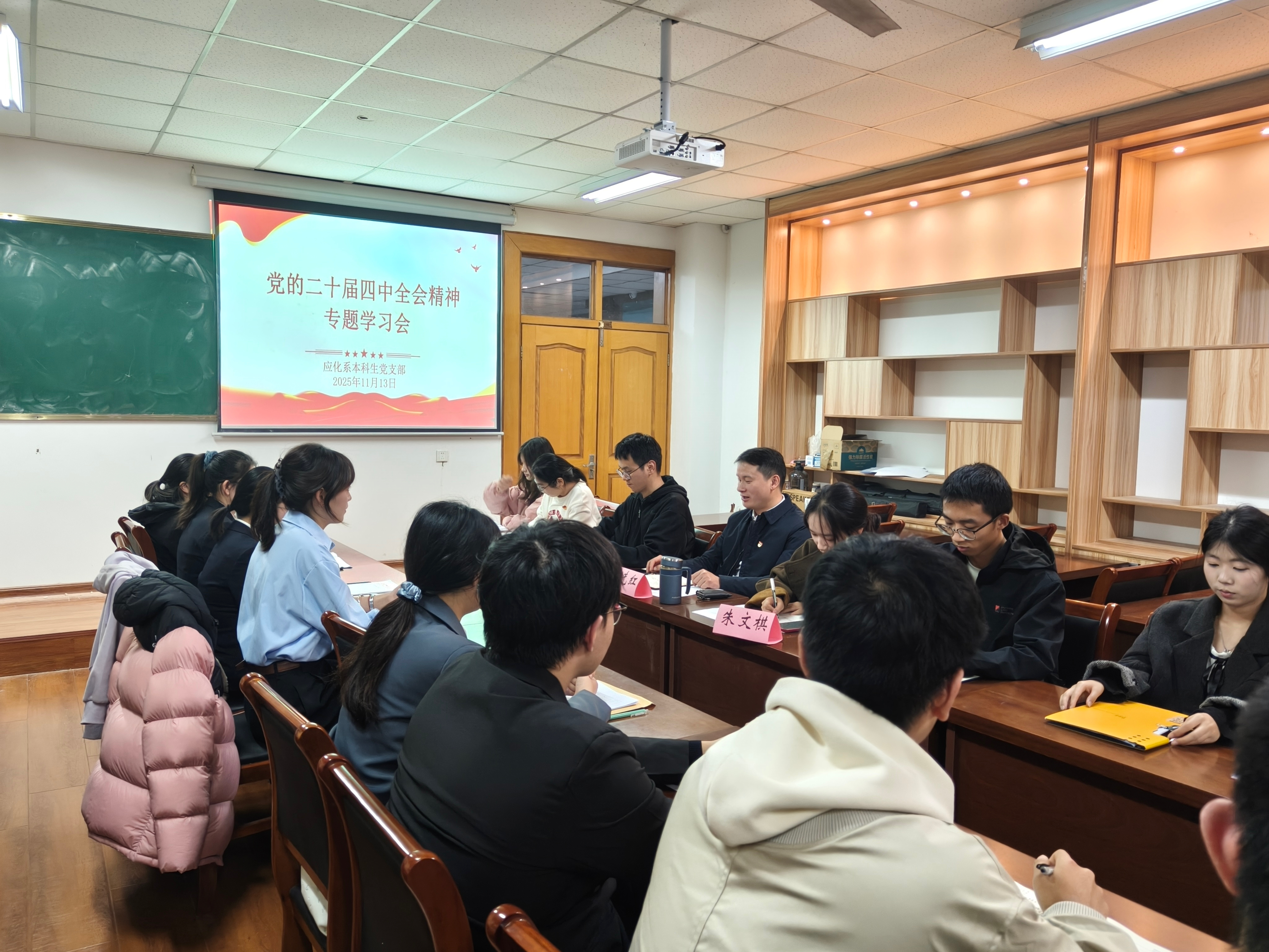 2025年11月13日下午,应化系本科生党支部于学苑6号楼114会议室召开了党的二十届四中全会精神专题学习会暨党员发展支部大会,学院党委副书记、纪委书记芮先红列席指导,会议由支部书记梁成主持。