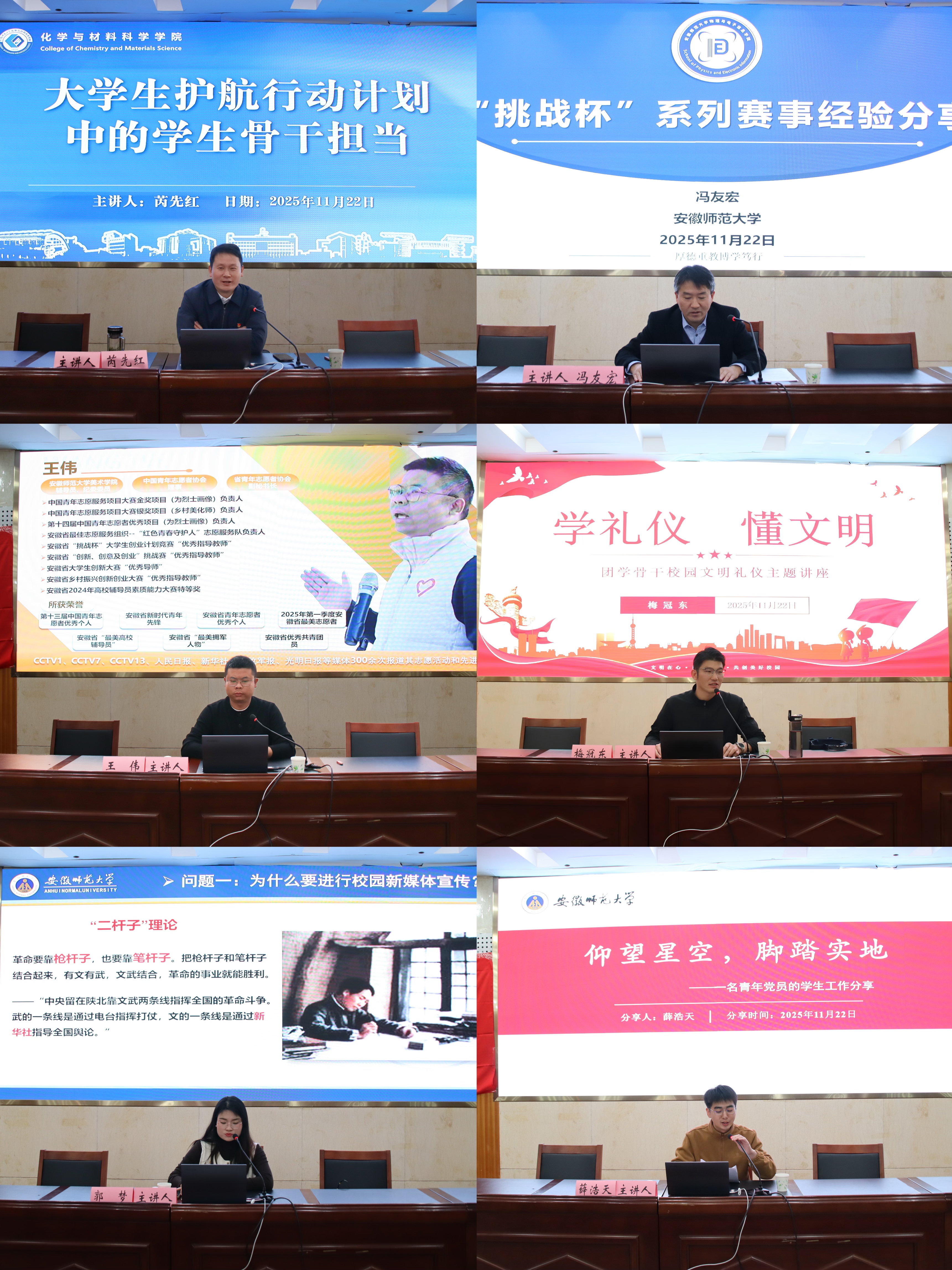 培训课程中,物电学院教授、博士生导师冯友宏围绕“挑战杯”全国大学生课外学术科技作品竞赛展开“挑战杯”系列赛事经验分享总结;学院党委副书记芮先红以《大学生护航行动计划中的学生骨干担当》为主题,对“大学生护航计划行动”进行了全面而深入的解读;美术学院王伟以“深耕志愿内涵守底色,弘扬志愿精神担使命”为主题,介绍了由安徽师范大学美术学院主导的红色志愿服务项目——“红色青春守护人”;校党委宣传部郭梦就校园新闻宣传的重要意义、实践方法与工作要求向同学们展开了详细的介绍。学院辅导员梅冠东以“提升文明素养,共筑文明校园”为主题,对学生骨干进行文明礼仪培训。青年党员、校研支团志愿者、化学专业2023级研究生薛浩天以“仰望星空,脚踏实地”为主题,介绍了自己作为研究生支教团成员期间的经验与感悟。