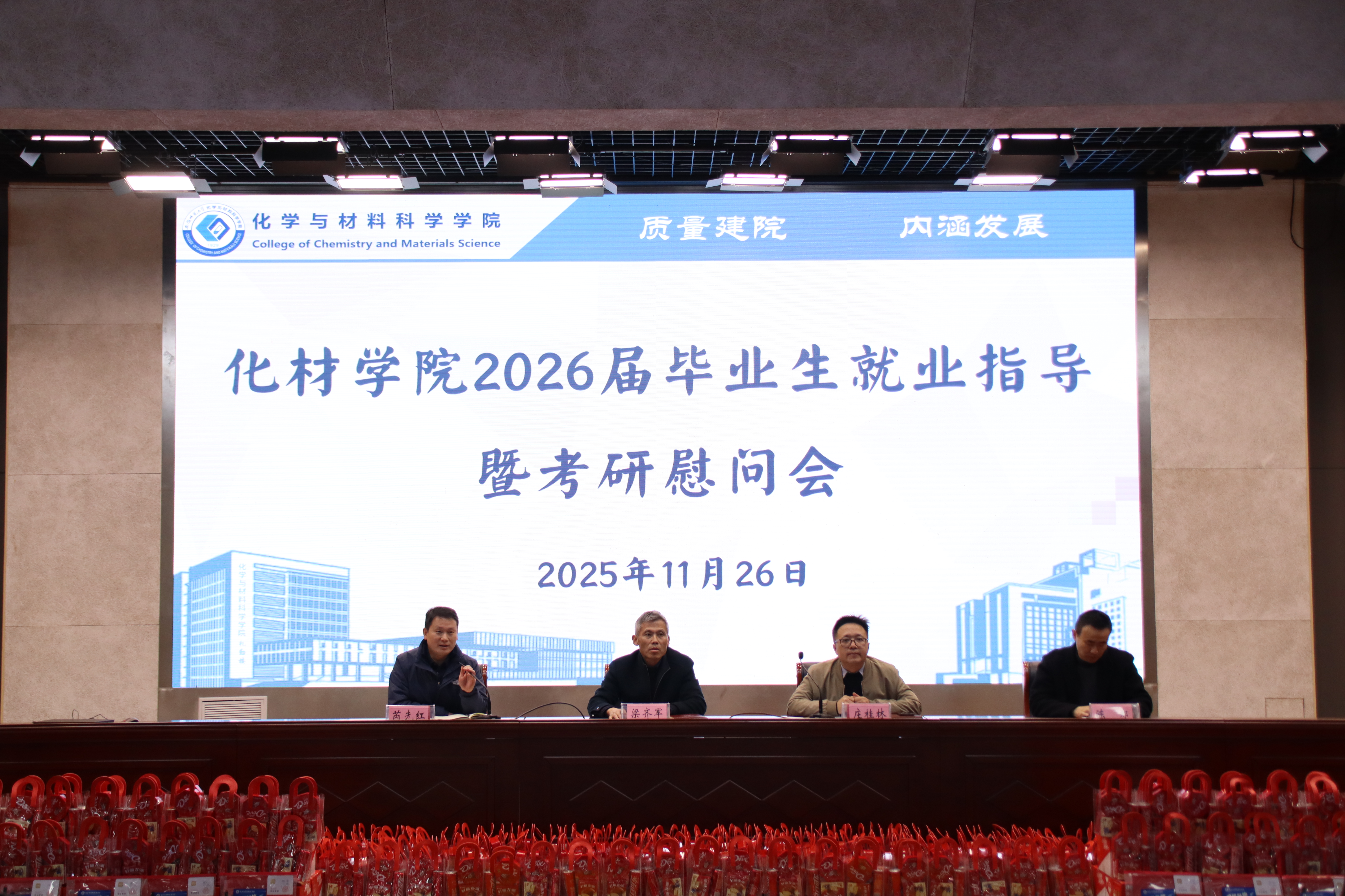 为切实做好2026届毕业生考研就业工作,11月26日下午,篮球比分手机 在理科大楼报告厅召开2026届毕业生就业指导暨考研慰问会,学院党委书记梁齐军、院长庄桂林、党委副书记芮先红、副院长陈郑、毕业班辅导员及2026届全体毕业班学生参加会议,会议由芮先红主持。