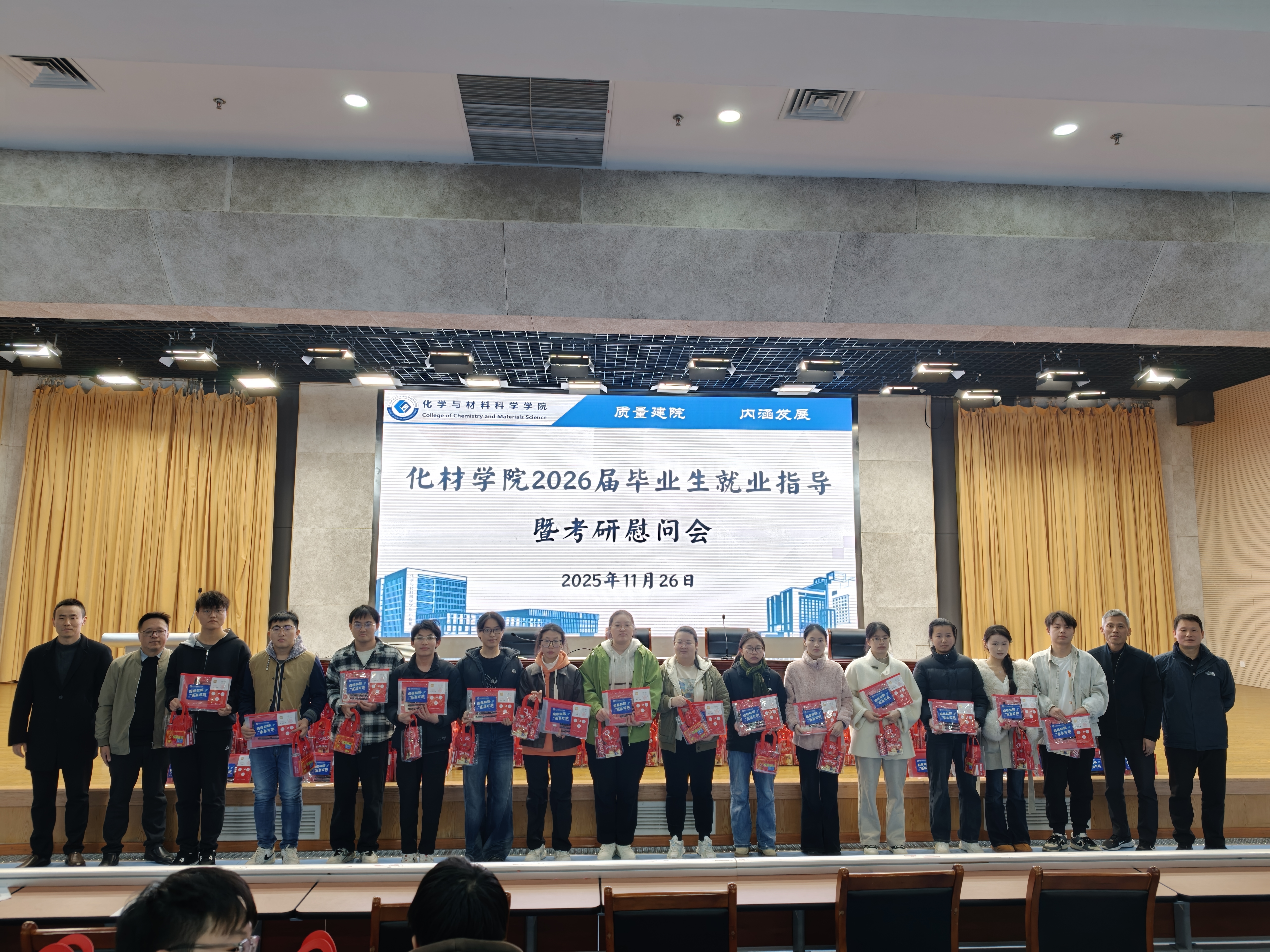 最后,学院领导班子与辅导员化身“暖心后援团”,为冲刺阶段的考研学子送上定制慰问礼包,鼓励学生以“滴定分析”的精准态度攻克难点,以“合成反应”的耐心积累静待收获。学院将全力落实“就业帮扶工程”,陆续开展考研复试与公考面试专项辅导、化材类专场招聘会等活动,开展常态化跟踪与帮扶,助力2026届毕业生圆梦。