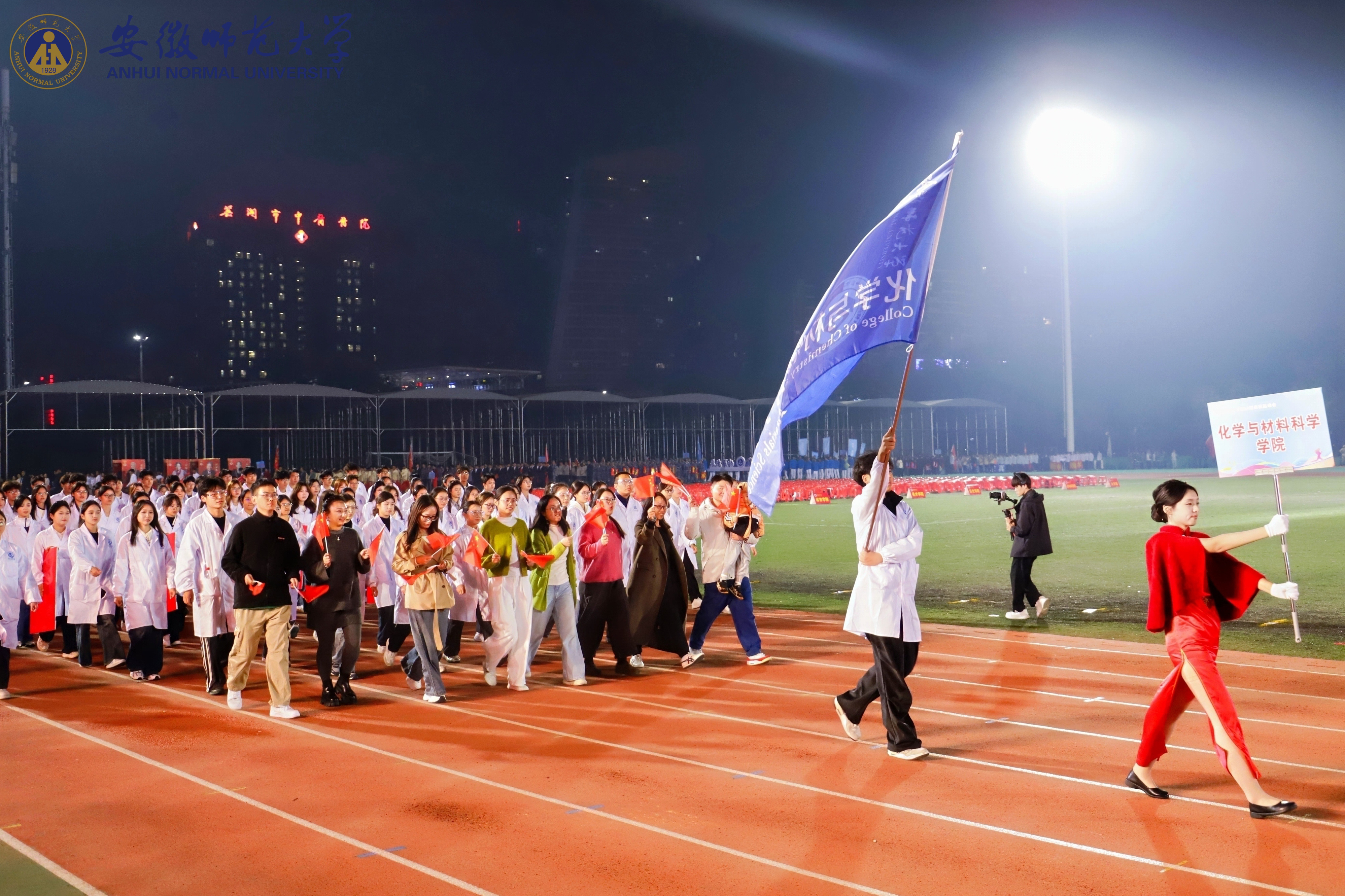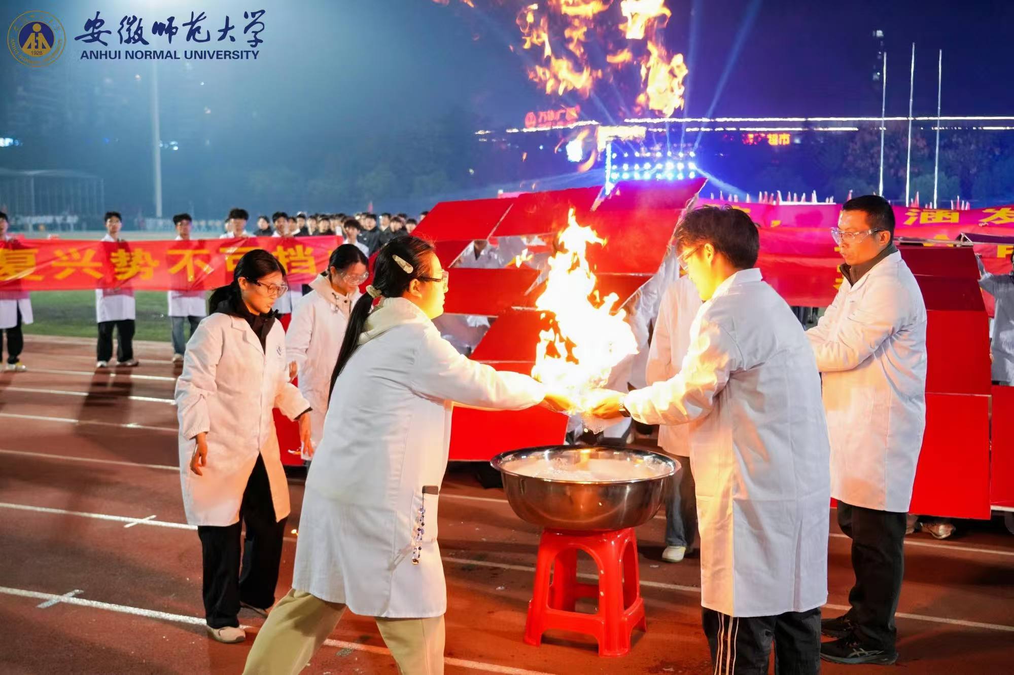 方阵迈着坚定步伐向主席台行进。本次方阵以“薪火相传”为魂,队伍后方学子依次展开红黄横幅,字样在灯火下煜煜生辉,既承载着对峥嵘过往的深情回望,也饱含着对璀璨前程的矢志笃行。队伍中间,三十名学子手持红白色KT板摆出“八十”造型,镌刻岁月峥嵘;前方的传火仪式意蕴深长:学院教师代表引燃首簇星火,经四位学生会骨干与老师接力传递,最终点燃主火炬。这跃动的火苗,是红色血脉的延续,更蕴藏着化材人探知未知的赤诚,学子们将以星火为引,在赛场拼搏与成长征途中勇担使命!