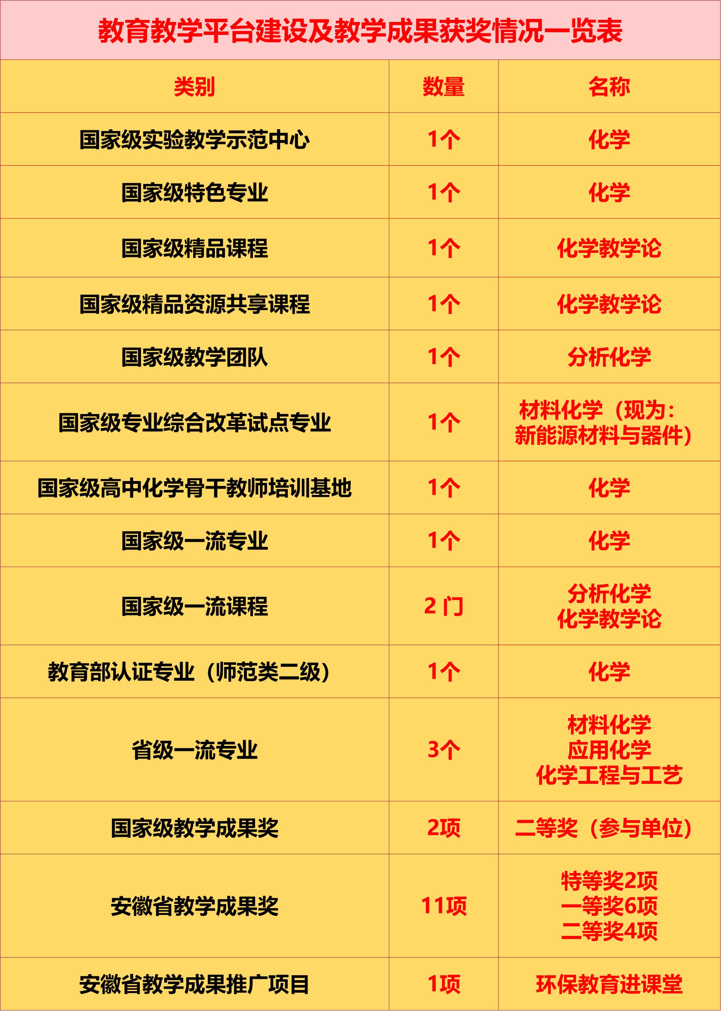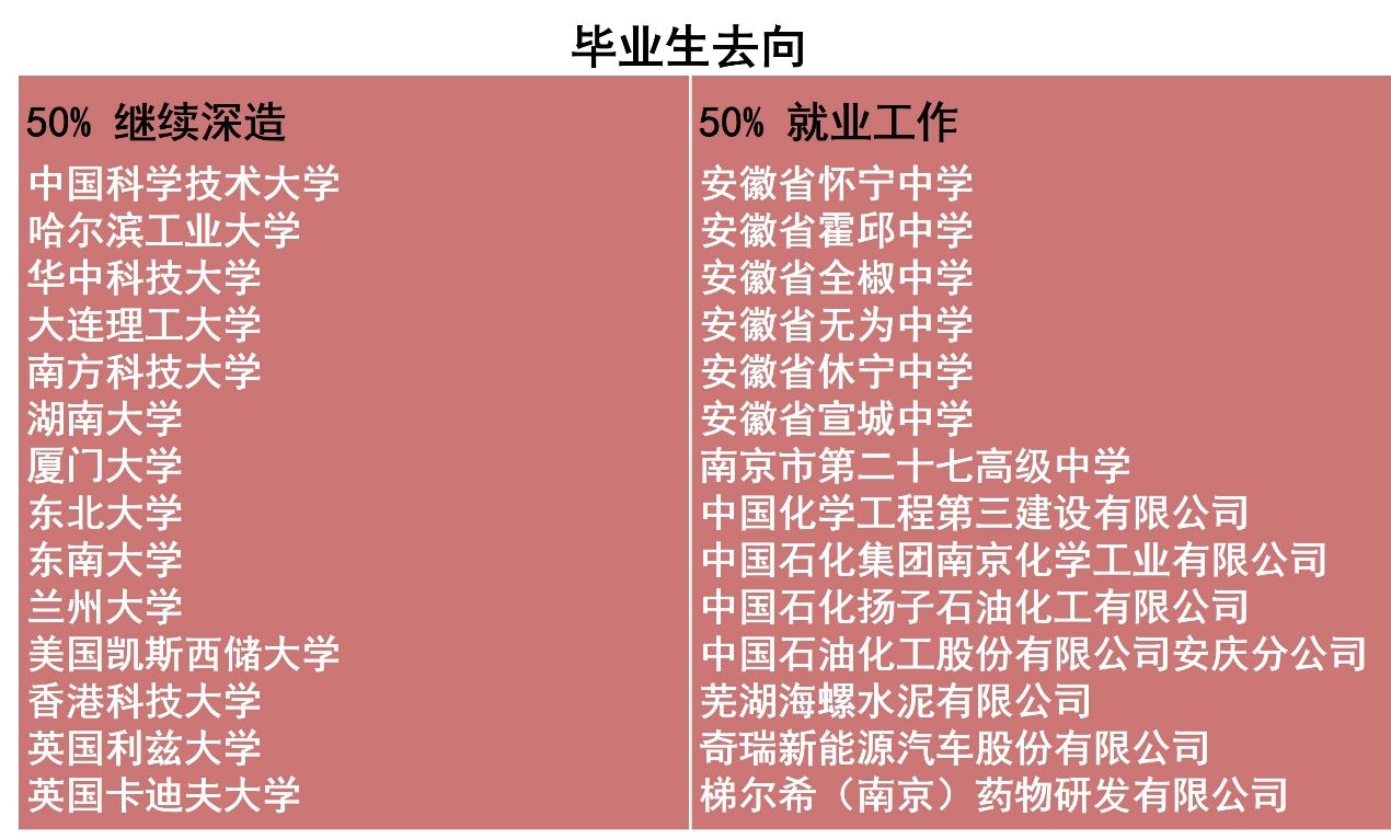 教学成果显著,为社会注入发展力量。近5年毕业生继续深造的平均比例大于50%,其中60%进入中国科学技术大学等双一流高校深造。化学师范专业毕业生就业方向主要为省内外省级师范高中;应用化学和化学工程与工艺的毕业生多数去往大型国有企业,如中国化学工程第三建设有限公司等;新能源材料与器件专业毕业生主要进入能源和材料类企业,如奇瑞新能源汽车股份有限公司等。